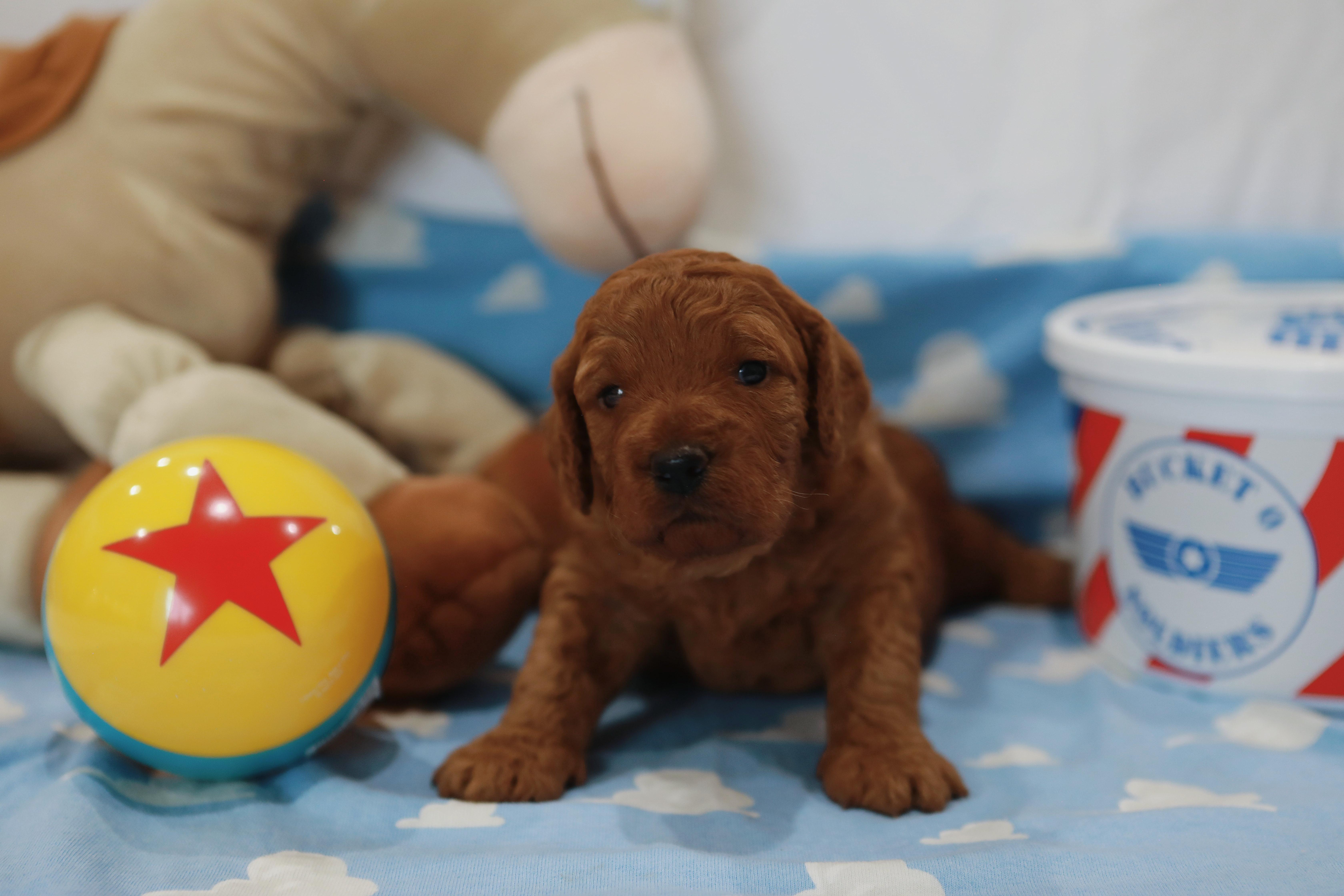 Our Goldendoodle puppies include apricot and red. Sheepadoodle puppies include fawn and white, brown and white, and black and white. Colors will vary depending on the parent dogs.