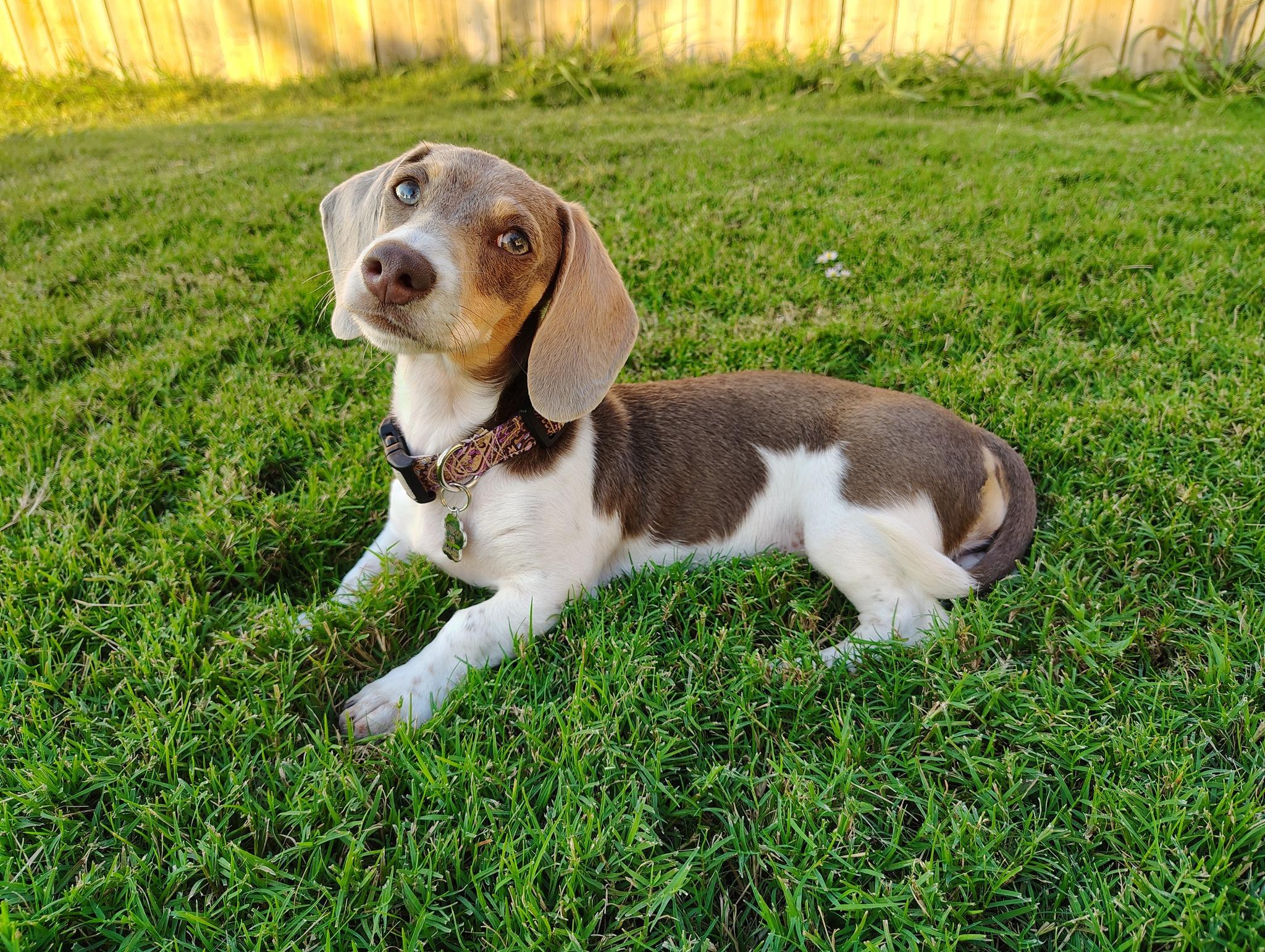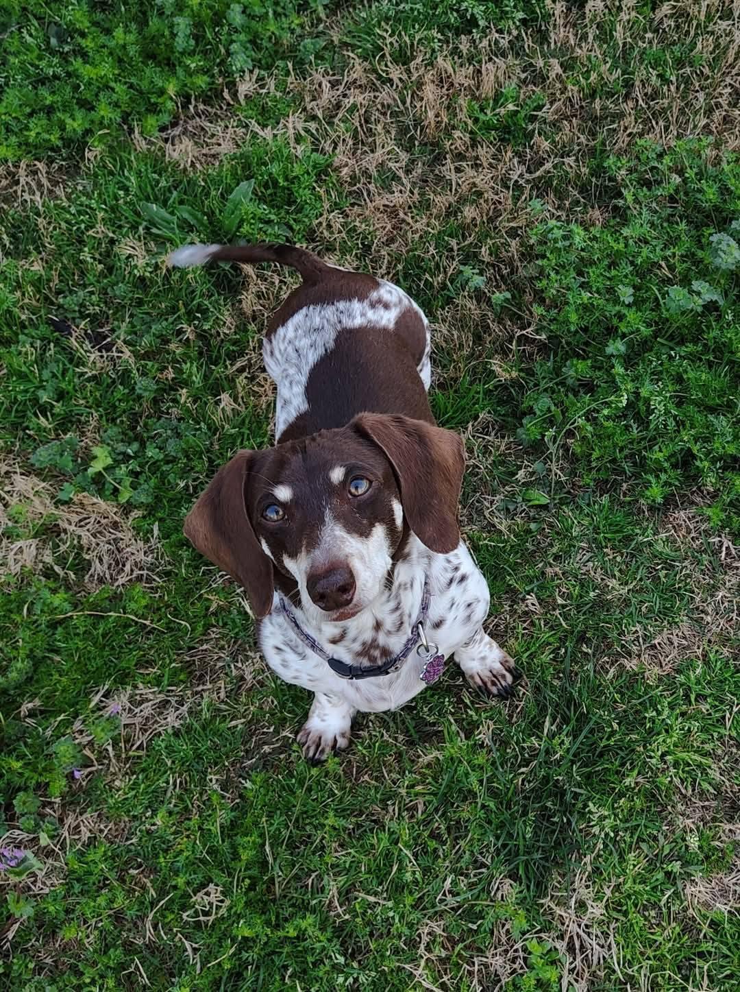 Mona is our AKC registered smooth coat chocolate & cream piebald that carries dilute & longhair. She has the most loving personality I've ever seen in a dog and she is by far one of the best snugglers and is never far from my side.