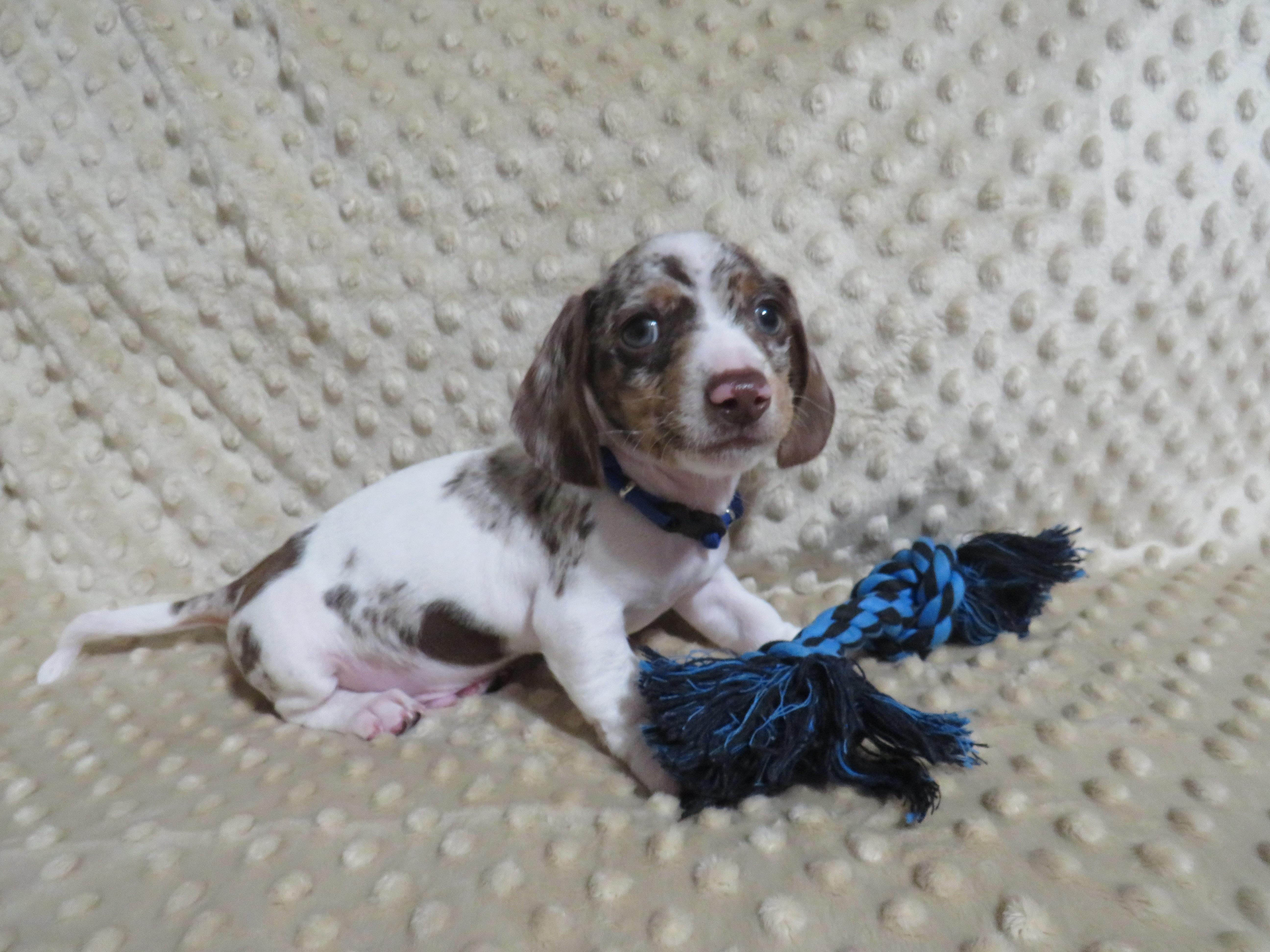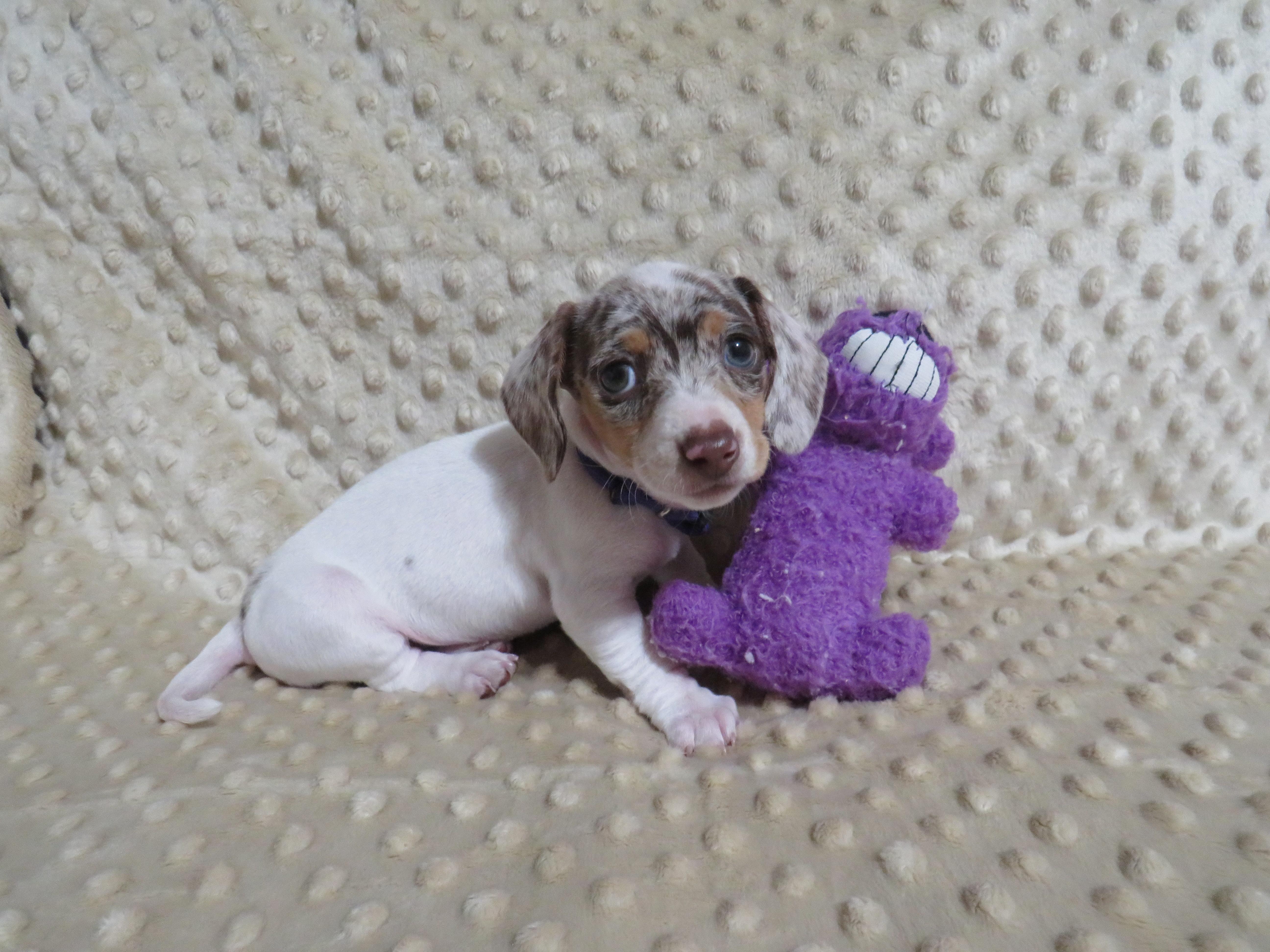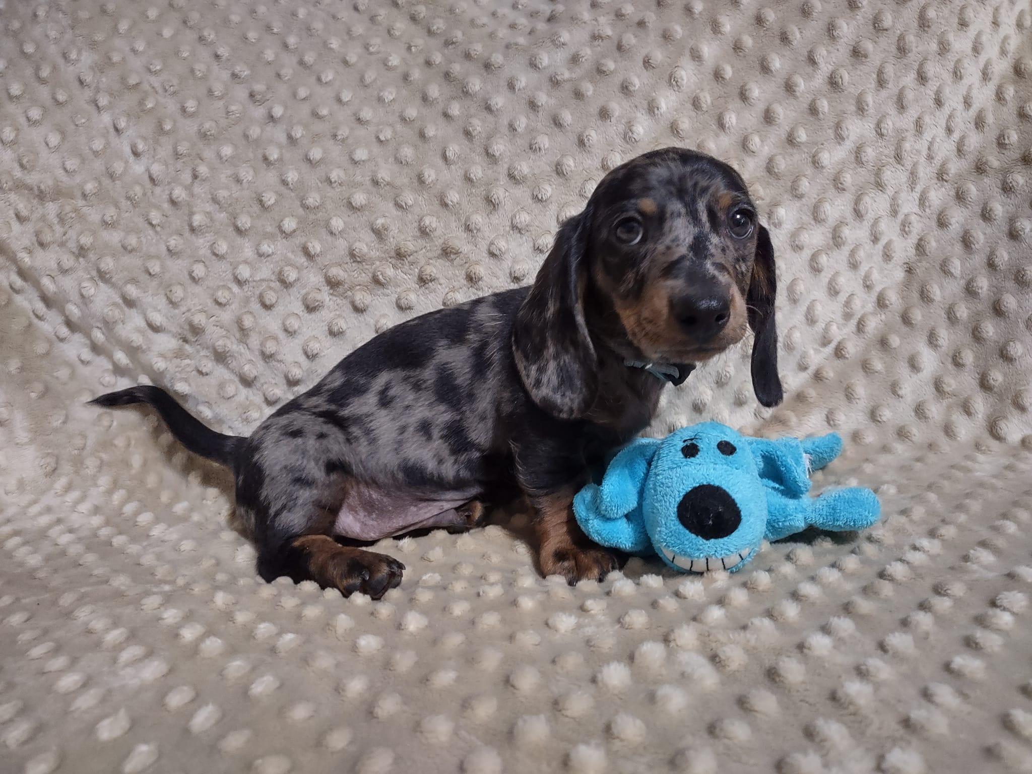 Pistol is our AKC registered longhair blue dapple that carries chocolate and brindle. She is the sweetest girl and has such a playful personality!