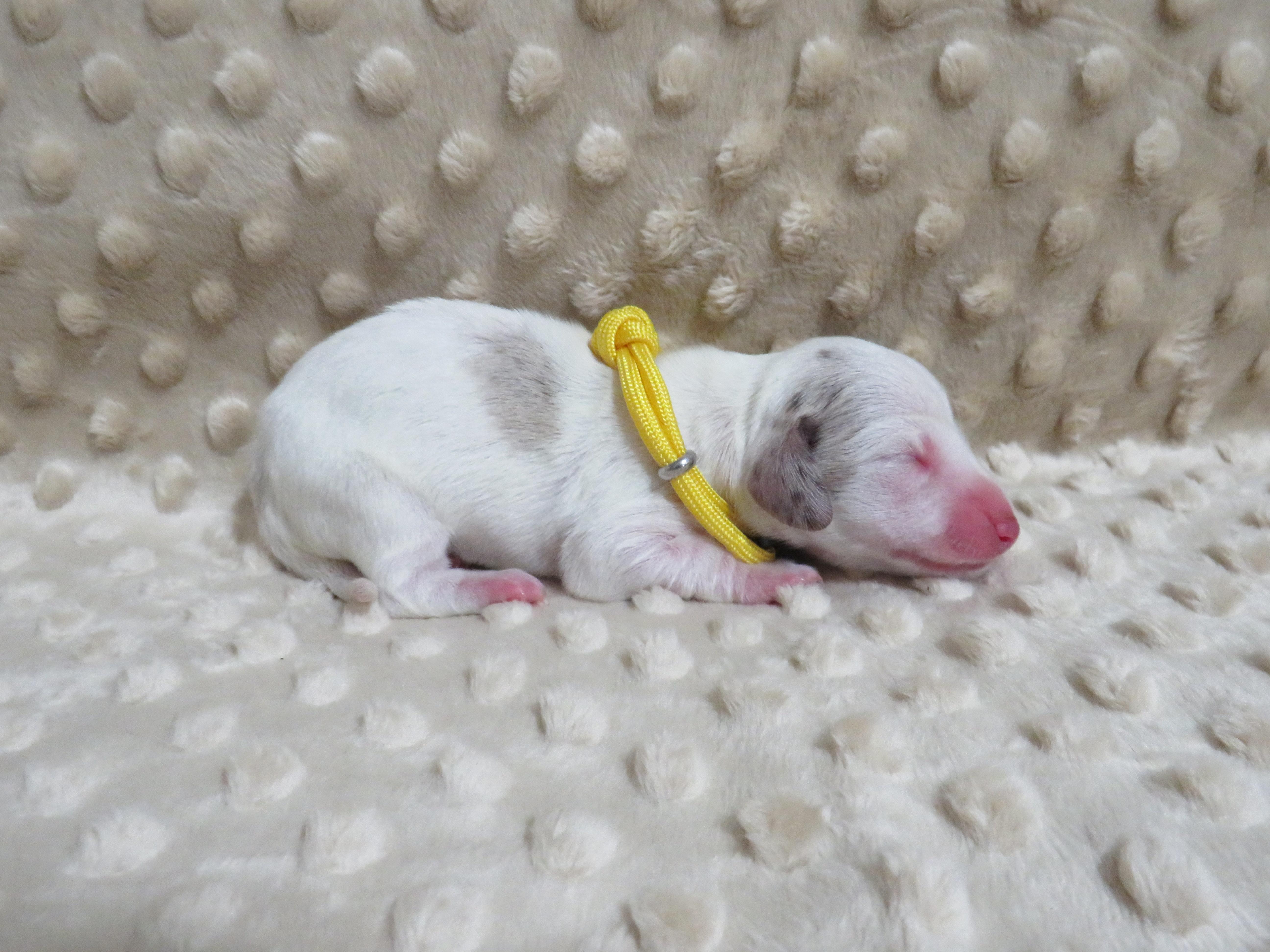 Kimber is our AKC registered smooth coat isabella & cream piebald that carries longhair. She is a very sweet girl with an outgoing and confident personality.