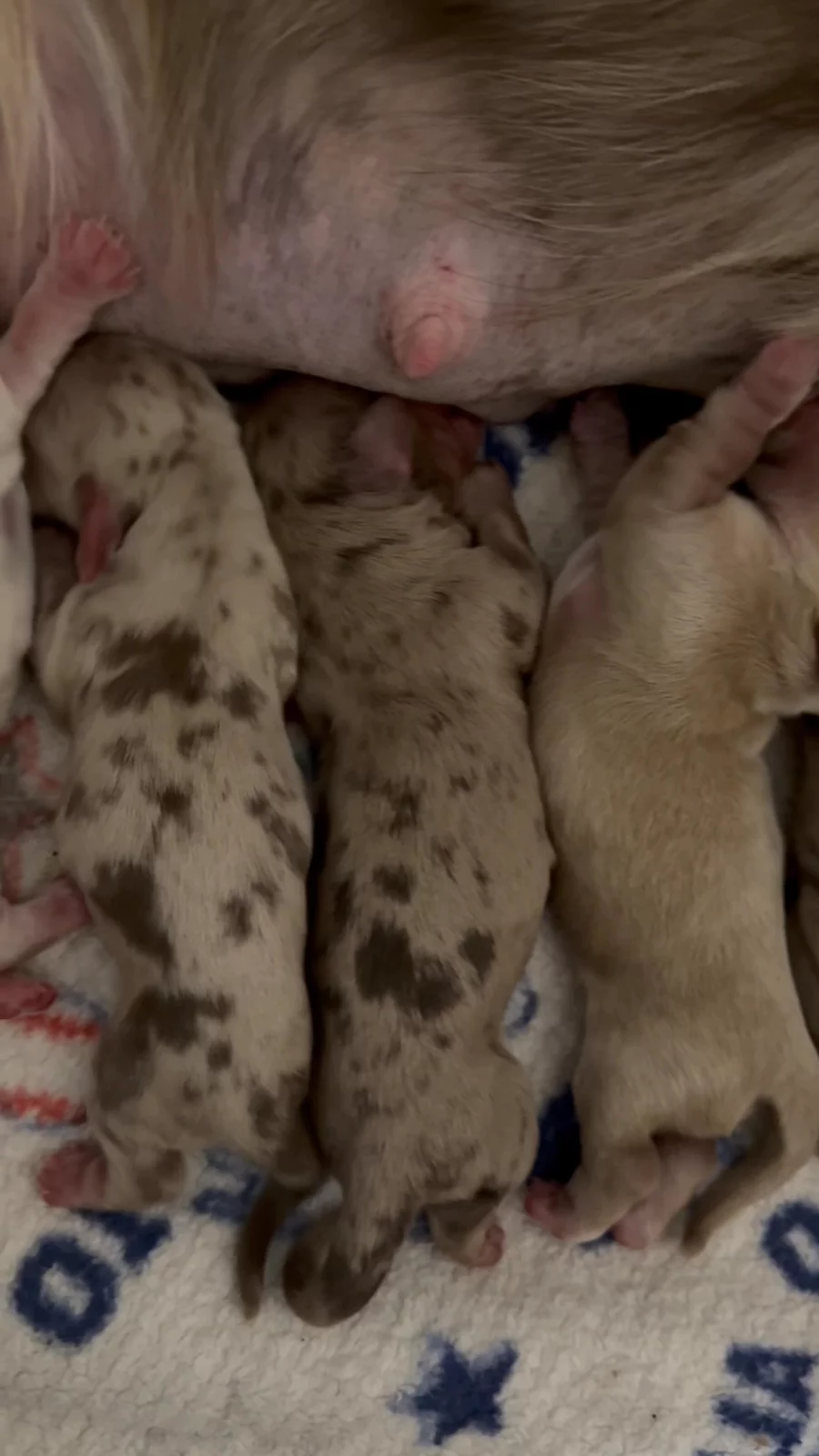 Beauty Queen (and Zeus) blessed us with 8 beautiful babies on Monday 10/20/25!! 🐾💕🥰🐶 Delivery started out perfectly, just as expected, but things took a little scary turn. She delivered six babies on her own without any issues, and then suddenly stalled. Of course, the worry set in because I could still feel movement and knew there were more little ones waiting. I decided it was best to call our vet, and she met us there within 20 minutes. The X-ray confirmed two more puppies still needed to make their entrance. They gave her a shot of oxytocin to see if she could finish delivering naturally, and about 15 minutes later, the seventh tiny baby arrived safely! She was able to have one more dose of oxytocin, but after another 45 minutes, that last little one was still being stubborn, so we decided iy was safest to proceed with c-section. Turns out she was a chunky girl who had managed to wedge herself up between Beauty Queen’s upper ribs—it was definitely a challenge getting to her, but she finally came out squealing with the strongest lungs you’ve ever heard! I am beyond grateful, because that’s not always the case when there’s a time gap like that. It was a very long and exhausting night, but worth every bit of it to ensure our precious girl and all her babies are healthy and safe. I always second-guess myself when I call the vet, thinking it might be too soon—but this time, it definitely wasn’t. 💕 All of these babies are ON HOLD (not available) at this time for our paid waitlist families. If you are one of those families, I’ll begin reaching out in one to two weeks once I’m sure all are healthy and thriving. There are several on my list as these babies will be ready just in time to spend their 1st Christmas with their forever families! ❤️
