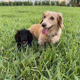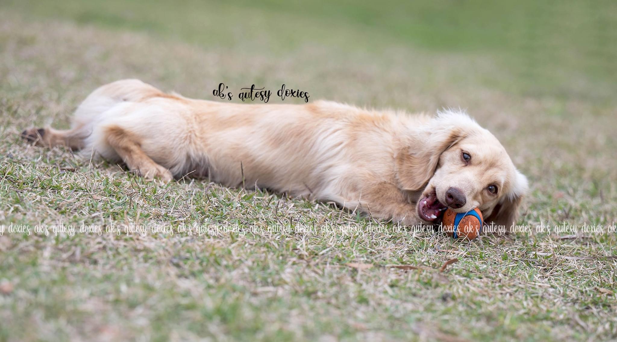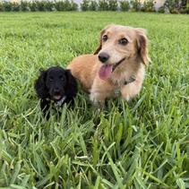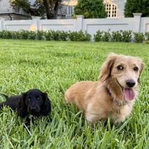 My love for the Dachshund breed began when I was just three years old. I grew up with two miniature shorthairs named Ginger and Gretchen. Ginger was a smooth coat red, and Gretchen was a smooth coat black and tan. Both were intelligent, loyal, and the heart of our family. Ginger especially loved when I would blow bubbles for her—she would chase them endlessly, determined to catch one.