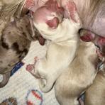 Our puppies include cream, brindle, blue and cream, fawn (isabella) and cream, chocolate and cream, black and cream, and dapple. Colors will vary depending on the parent dogs.