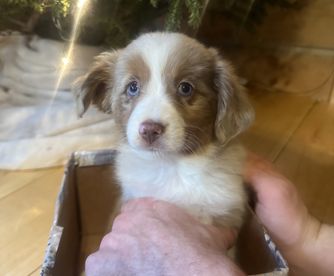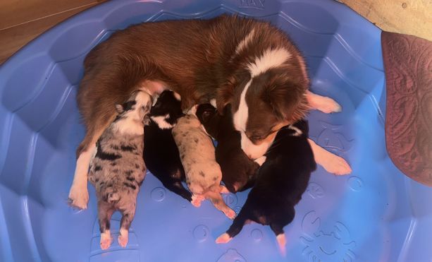 Our puppies include blue merle, black tri, red tri, and red merle. Colors will vary depending on the parent dogs.
