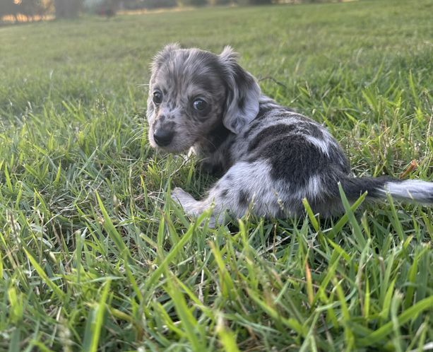 Our Dalmatian puppies include white and liver brown and white and black. Dachshund puppies are dapple. Colors will vary depending on the parent dogs.