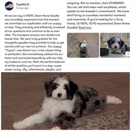 I got my little baby Lucy, from Down Home Doodles and couldn’t be happier. The whole experience was smooth, friendly, and thorough. Lucy came home healthy, super social, and with such a sweet personality. You can tell that she was raised with a lot of love and attention. The breeder kept me updated along the way, answered every question, and made the whole process easy. They give you access to a lot of information about your pup that's super helpful as well as making themselves available for any other questions or help you might need. They gave me all the confidence in the world in going with them. If you’re looking for a happy, well-adjusted pup from people who truly do it right, I’d 100% recommend Down Home Doodles. Lucy’s been the best addition to my family. Thank you!!