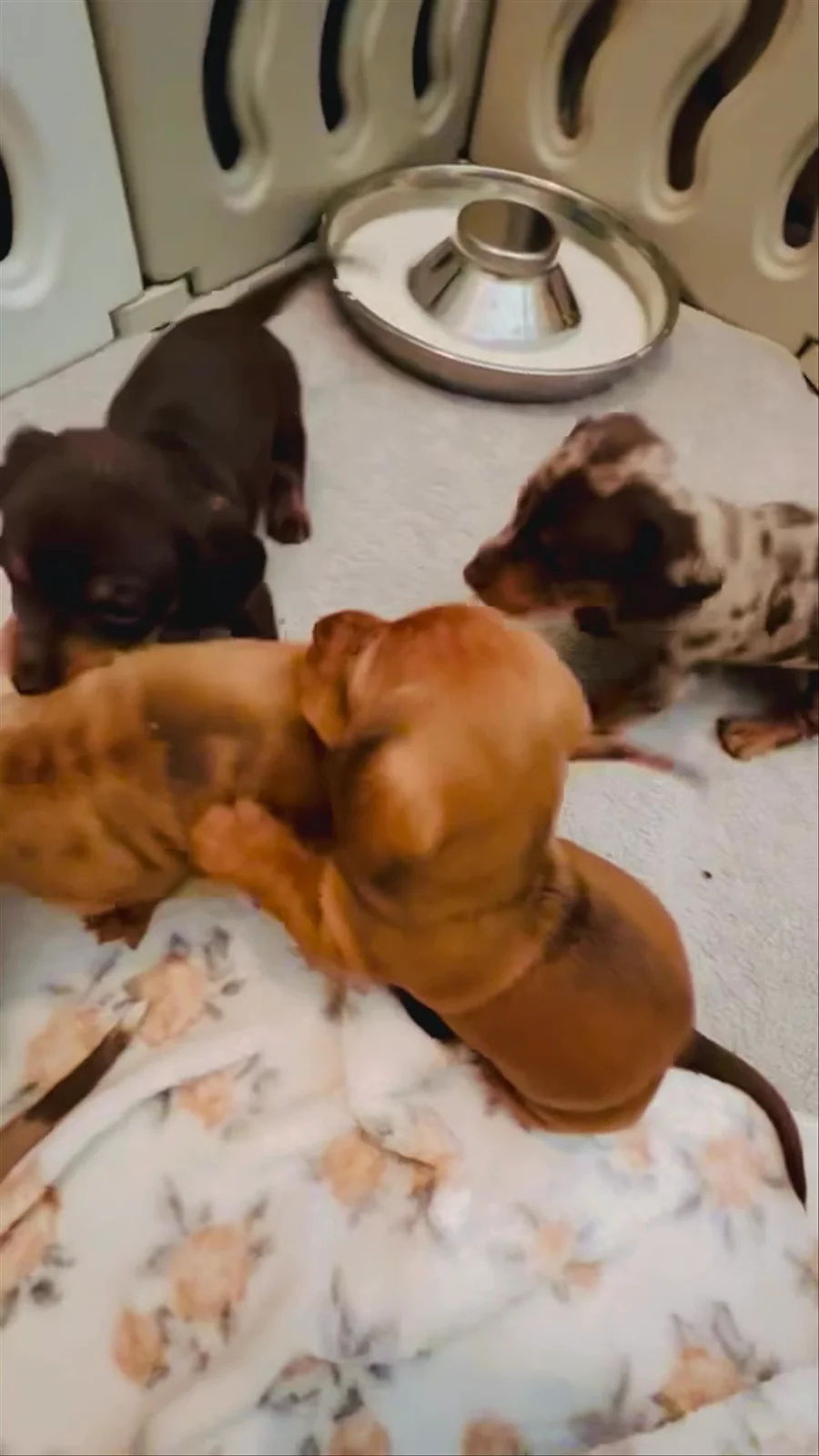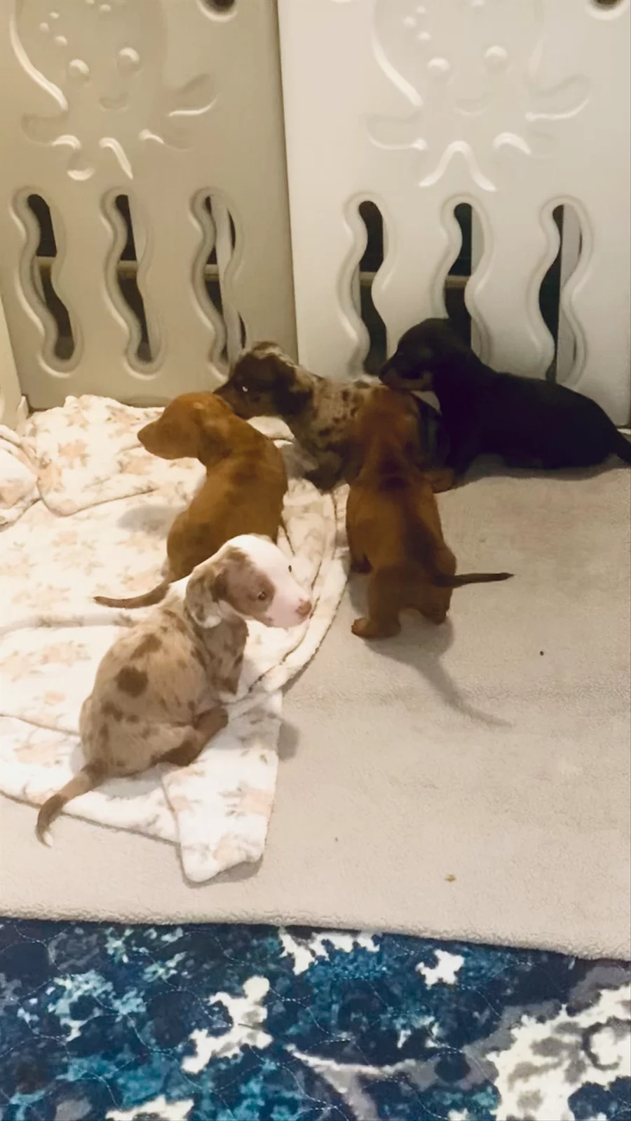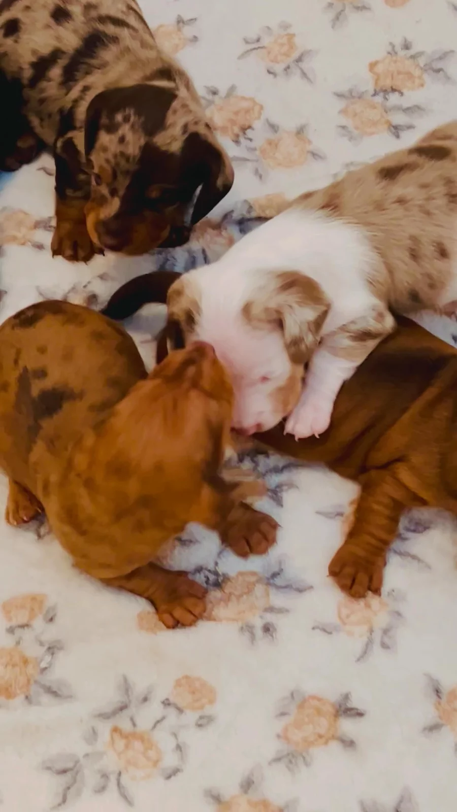 Rue is our silly little girl with such a sweet demeanor. Our beautiful chocolate tan dappled smooth miniature dachshund. Absolutely adore her unique spots, one especially that looks like a heart… so she is our little heart and we absolutely adore this sweet girl.