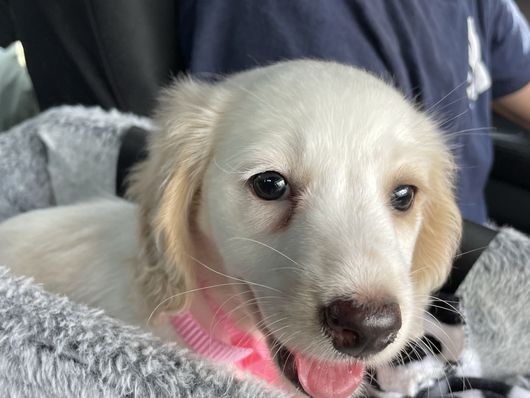 Gidget is our sweet cream piebald miniature dachshund with the most gentle and affectionate personality. She’s playful, curious, and loves being part of everything we do, but she’s also a total cuddle bug who enjoys curling up close. Gidget is fully AKC registered, comes from a strong pedigree, and is up-to-date on all of her shots and health testing. She’s loving, loyal, and full of charm — a little ray of sunshine in our lives.
