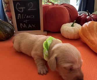 Alina is a female Dachshund. Carefully selected as a great representative of her breed, Tracy decided to make her part of their program. Tracy has passed Good Dog’s screening process, which involved a review of their breeding practices, environment, and the mental and physical health of their dogs.
