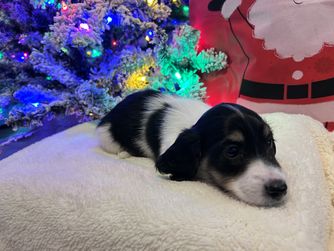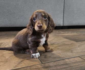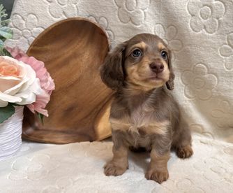 Bella Rose is a chocolate and tan dapple miniature longhaired dachshund who carries the piebald gene. She’s a very petite and delicate little girl, full of sweetness and love. Bella Rose is a true sweetheart she absolutely adores cuddling and being close to her people, always eager to snuggle up and share affection.