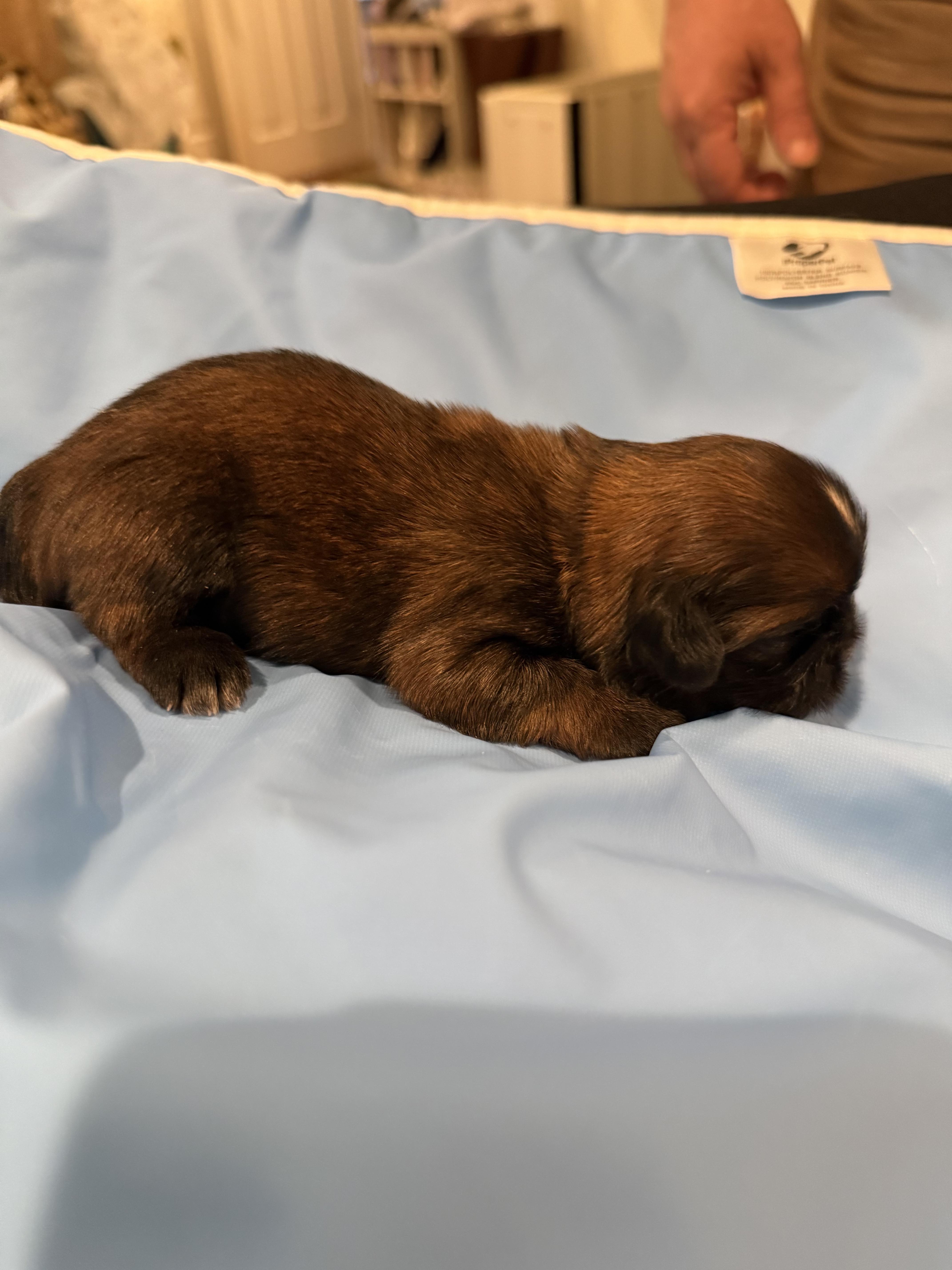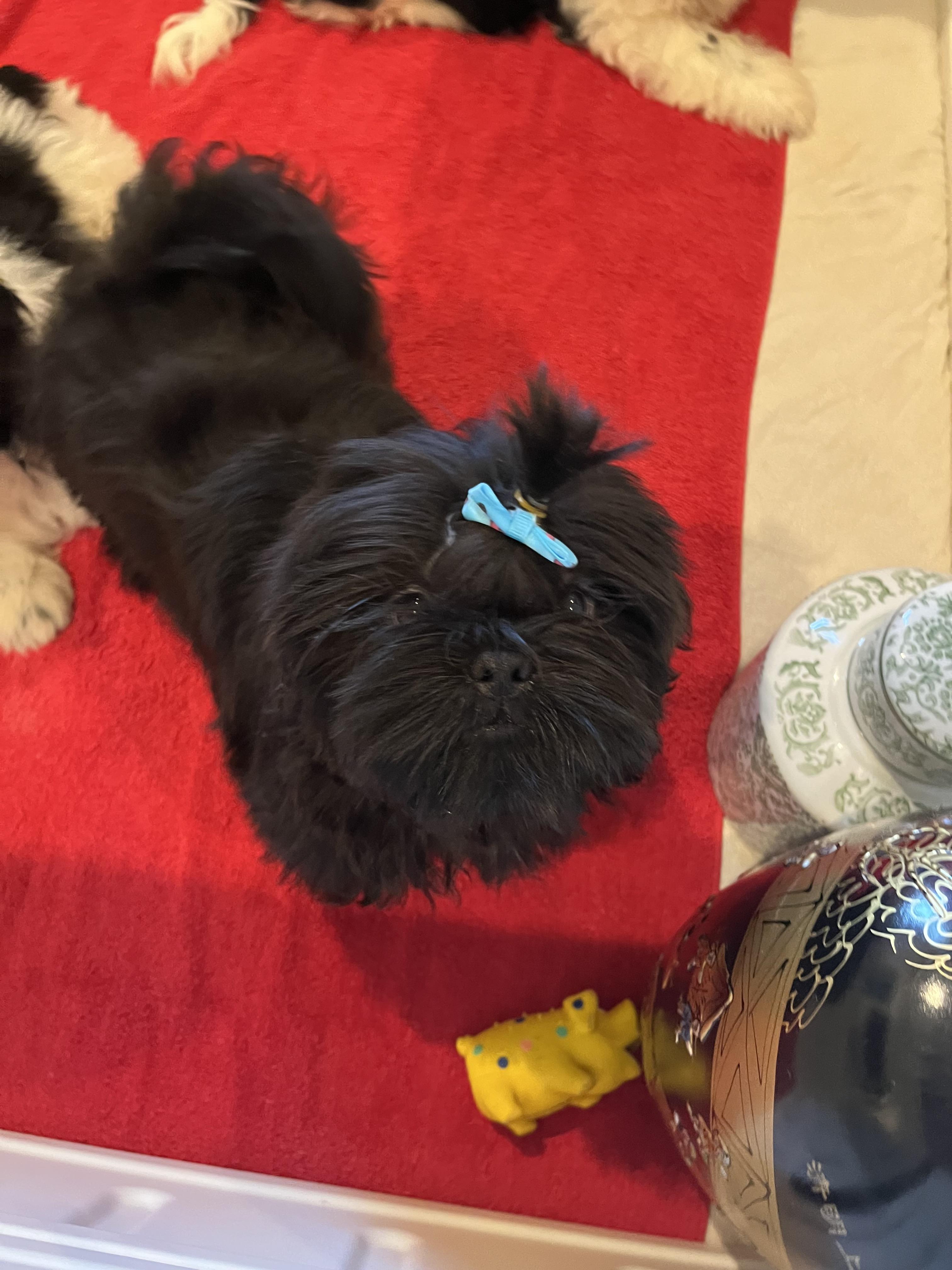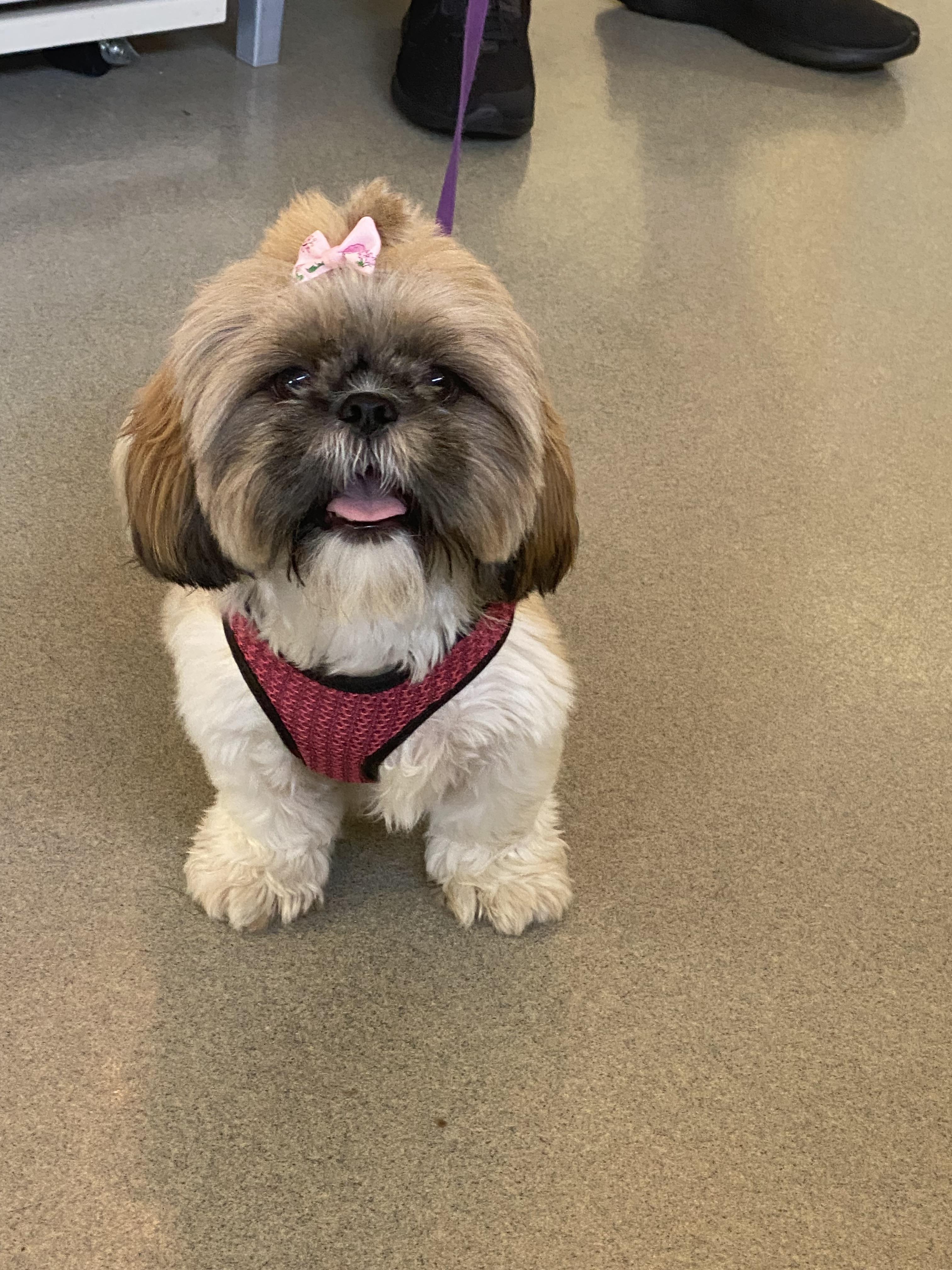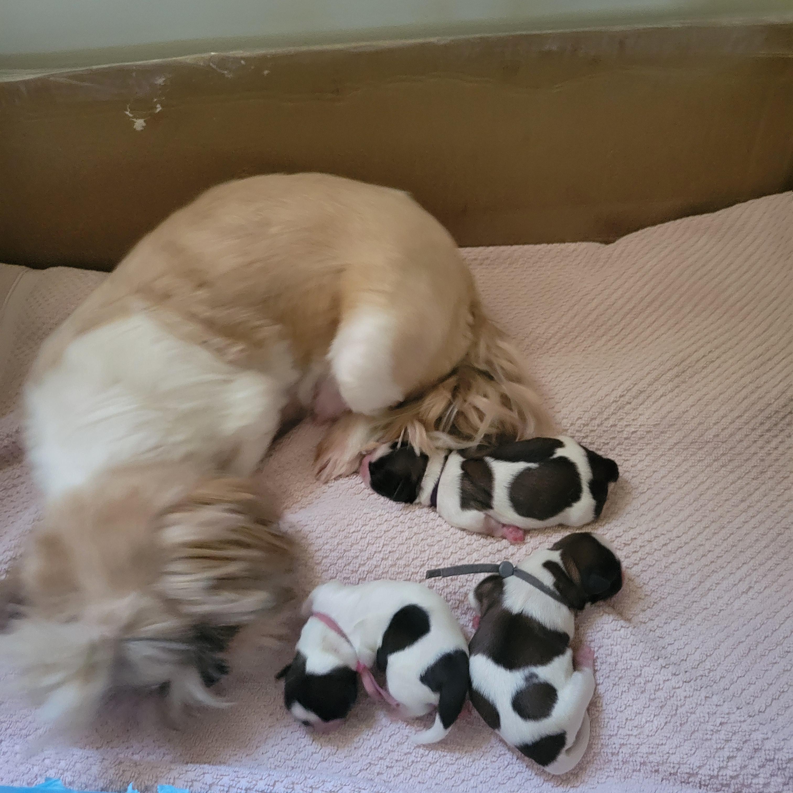 Tesla has a great shih-tzu personality, loves to feel special and she is the queen of our hearts. She us great with grooming, loves observing and enjoys outdoors, parks and car rides, she is very affectionate. Tesla has beautiful liver brown coat and is an absolute sweetheart, nicely tempered, spoiled and adored by our all family members. She is a very attentive mother and has a happy+ affectionate personality, gets along with everyone. Tesla is going to retire this year and this litter is her last one, we want to enjoy her off duty. Her puppies are super cute, come in different color combinations and we love feeling their kicking in the belly. She is our special momma.