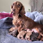 Our experience with Kayce and DrakeFire Dachshunds was more than we could have hoped for. Kayce responded to all communication within minutes or hours and answered all of our questions in detail. Our puppy is the sweetest little guy and has already cemented his place in our family. He is already potty pad trained (on day 1!!!) and has the best temperament (sweet, cuddly, playful…). One of the things I most appreciated about Kayce was our Sunday “Pup-Dates” where she sent pictures, videos, and information about how he was doing. On our pickup day, Kayce had a bag ready to go with his food, registration and vet papers, favorite toys and a tiny collar and leash. Kayce brought our puppy’s dad out to meet us which was such a wonderful surprise! He is beautiful, well behaved and has an awesome temperament (giving us a glimpse of how amazing our puppy will be)! She clearly loves her dogs/puppies and we could tell that she is invested in the health and happiness of these beautiful babies.