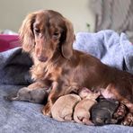 Mother dog Tink has faired excellent through her pregnancy and is getting close to her date of whelping. I can gauge this by observing that her belly has drooped lower into a more “hanging” position vs the previous look of her belly was close to body on the underside and outward protruding on each side. When looking downward at her from above, you can now see her waistline is more pronounced since her belly is drooping toward the floor. When she is laying beside me on the couch, I can feel the babies moving under her skin against my leg. If I place my hand gently on her tummy, I can feel them rolling and kicking just below my hand. It’s a magical time for us here at DrakeFire Dachshunds, with a similar vibe as to Christmas Morning 🎁 🐾 😇 Will update soon!