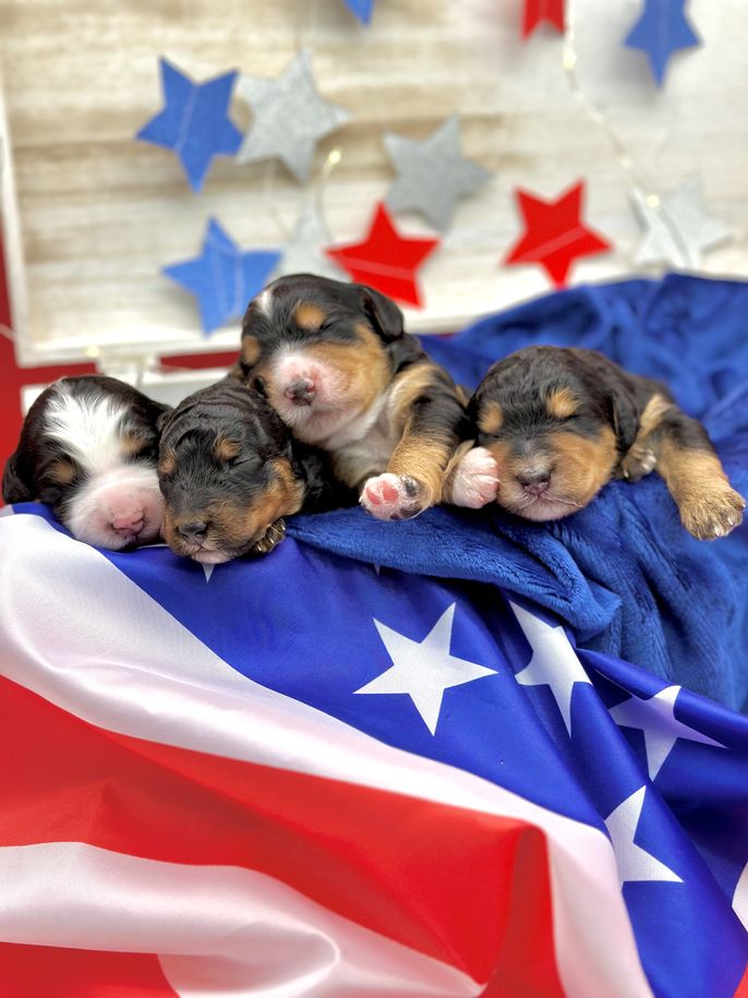 Our Bernedoodle puppies include tri-color and phantom. Goldendoodle puppies include cream, apricot, red, and parti. Colors will vary depending on the parent dogs.