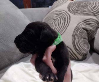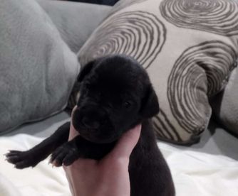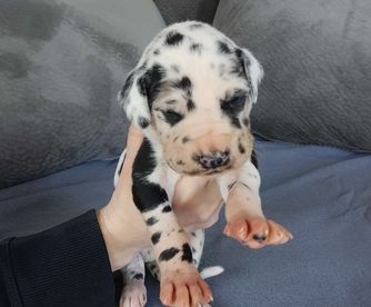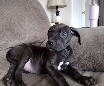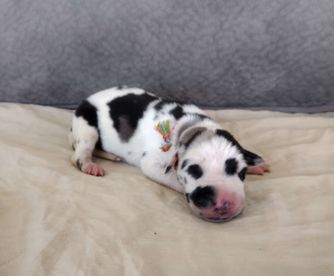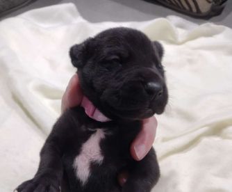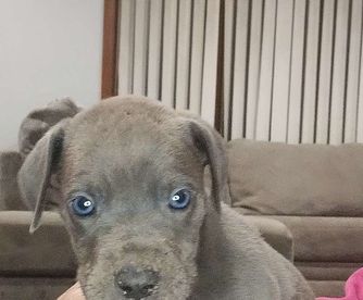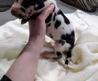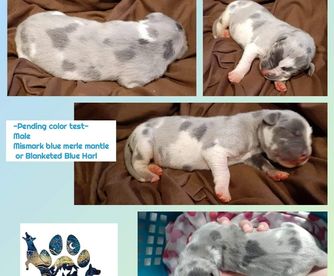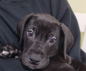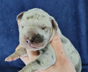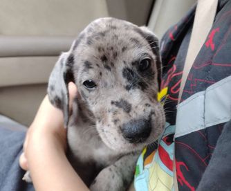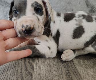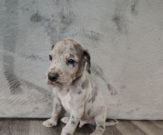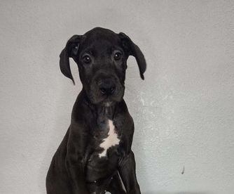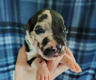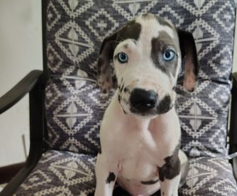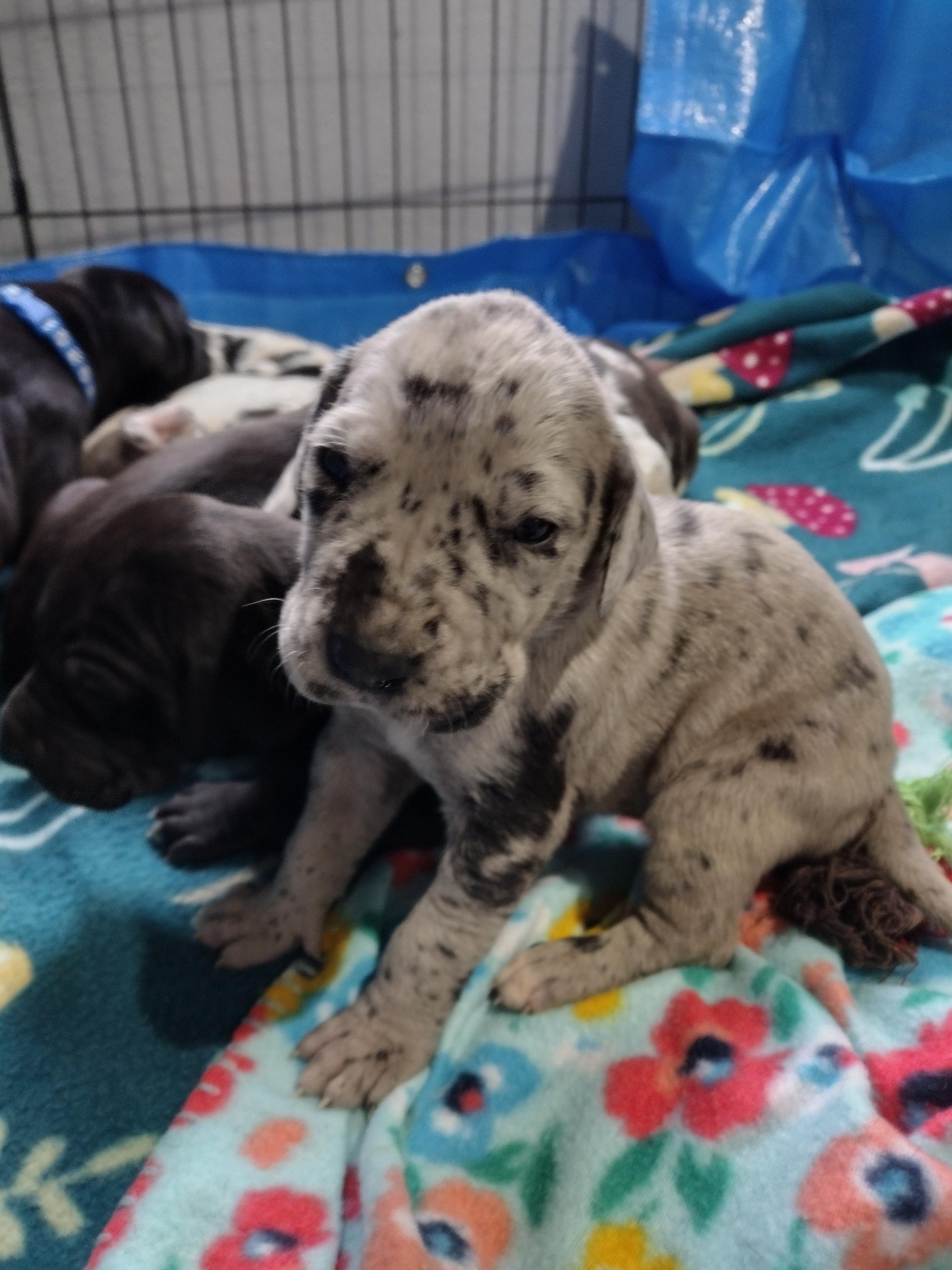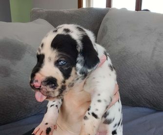 Great Dane puppies include chocolate and white, chocolate, blue and white, black and white, blue, harlequin, merle, and black. Colors will vary depending on the parent dogs.
