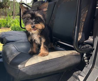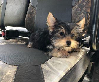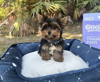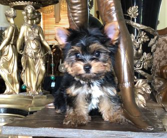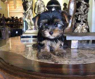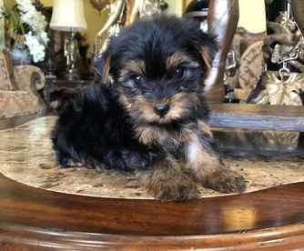 Our Yorkshire Terrier puppies include black and gold and black and tan. Pomeranian puppies include black, chocolate, and beaver. Colors will vary depending on the parent dogs.
