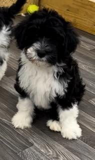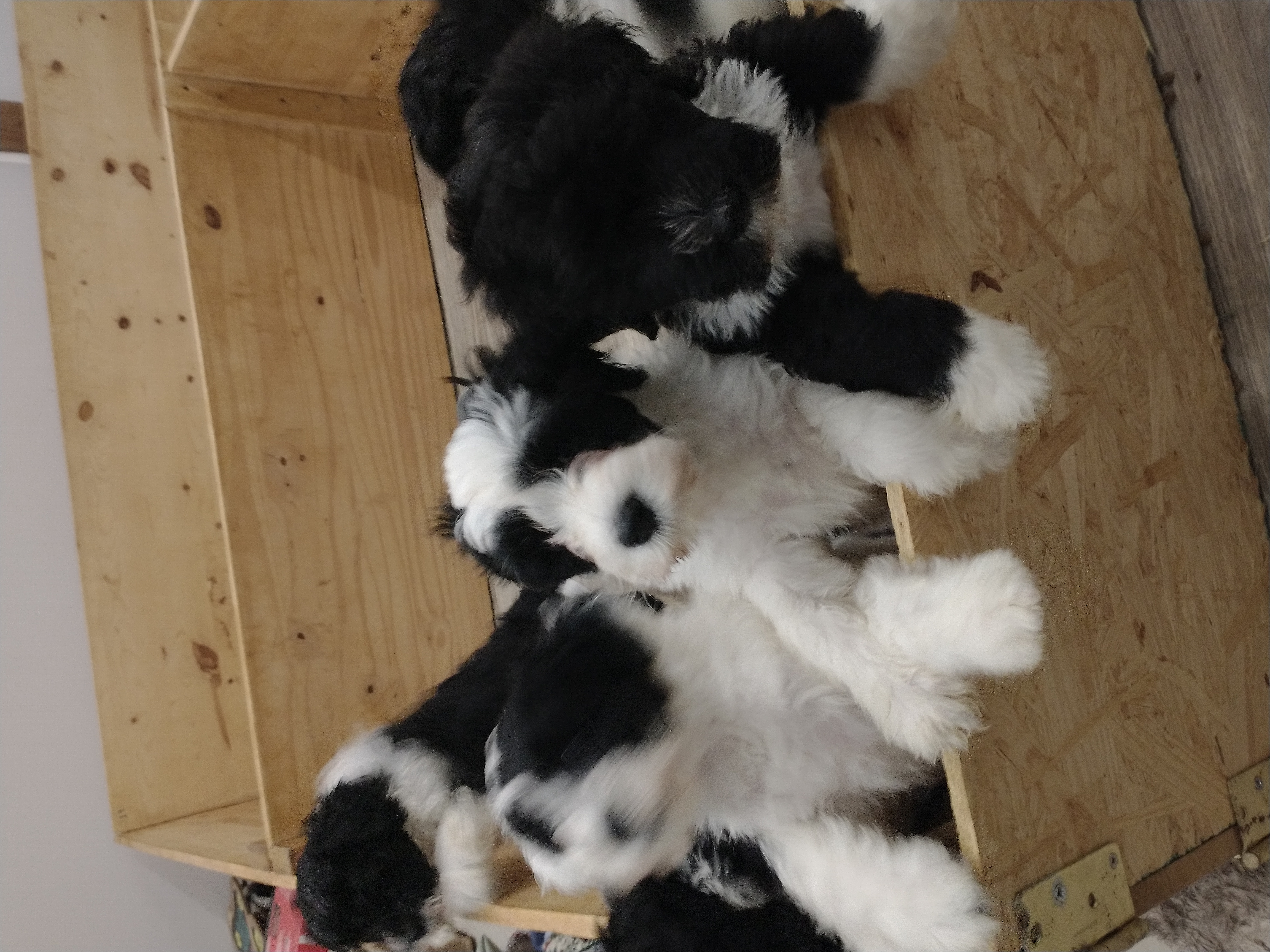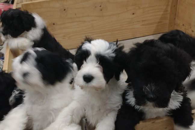 Our puppies are black and white. Colors will vary depending on the parent dogs.