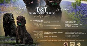 I'm Danny - Tracey F., the breeder behind D&T Boykin Spaniels located in Adkins, TX. At D&T we believe that every dog is unique & deserves individual attention & care. With some of the best pedigrees around… HRCH GCH CH Drwatson Tybee-Dixietreat-Indy MHR, SHR, HR HRCH Wildbrier's Lawman Reverend Brown MHA UGA (Boo) SHR Extreme Texan Rio Bravo HRCH Spartacus RomeMontiFields MHR.