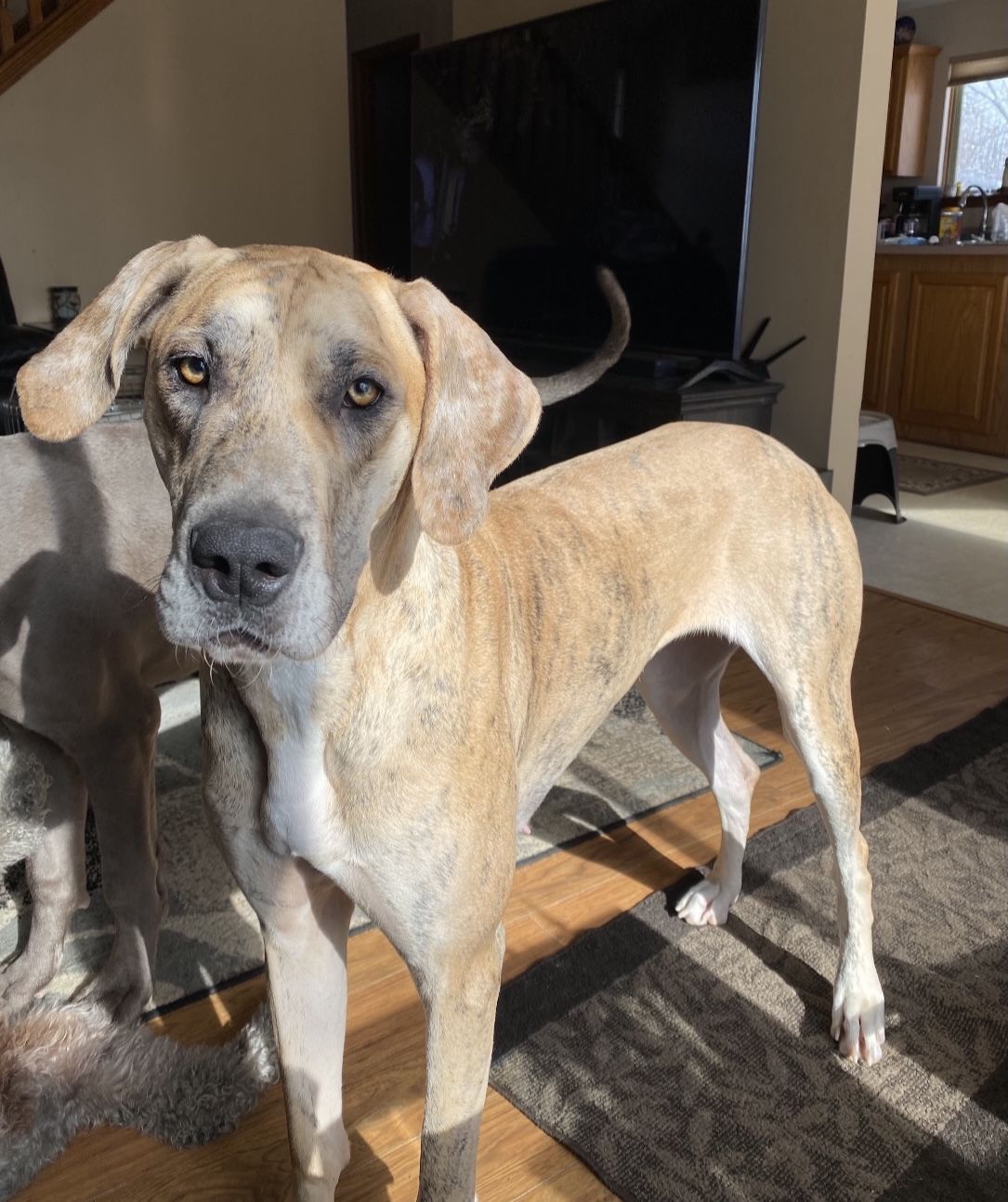 Georgie is a female Great Dane. Carefully selected as a great representative of her breed, Nicole decided to make her part of their program. Nicole has passed Good Dog’s screening process, which involved a review of their breeding practices, environment, and the mental and physical health of their dogs.