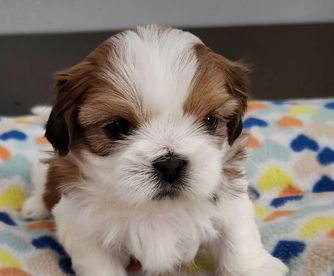 Our puppies include red and white and brindle and white. Colors will vary depending on the parent dogs.
