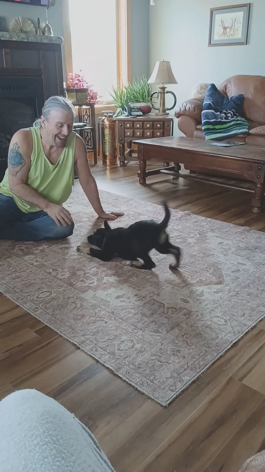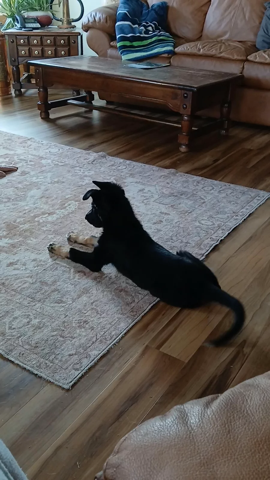 We are going to have a hard time saying goodbye to this precious girl ebony! As her personality blooms i now see her as ebony olive. My goodness she is full of love such a amazing temperament I can't praise her enough. We are moving on to kennel training with her. So far doing great. Trots through the house!! No accidents. Pictures do not do her justice with her dark color.