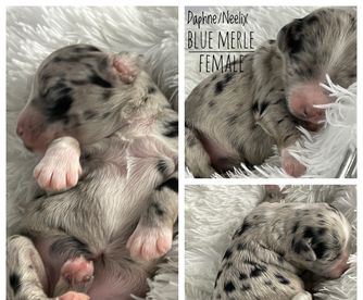 Juliet’s puppies are getting chunky! Tails and dew claws were docked a week ago, toe nail trims yesterday and we are getting to peek at their stunning blue eyes! The puppies love being held and snuggle right in. New photos coming in a couple of days.