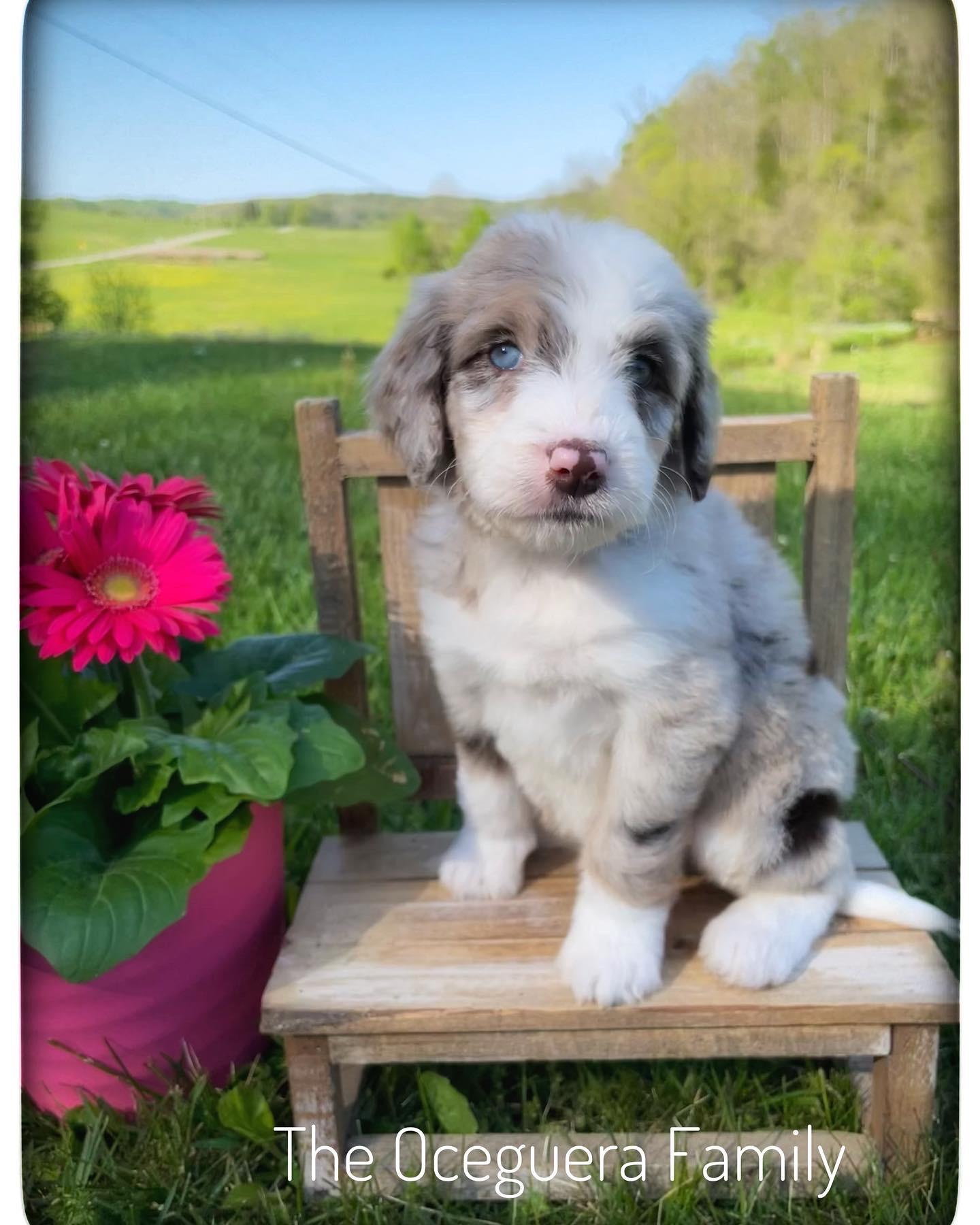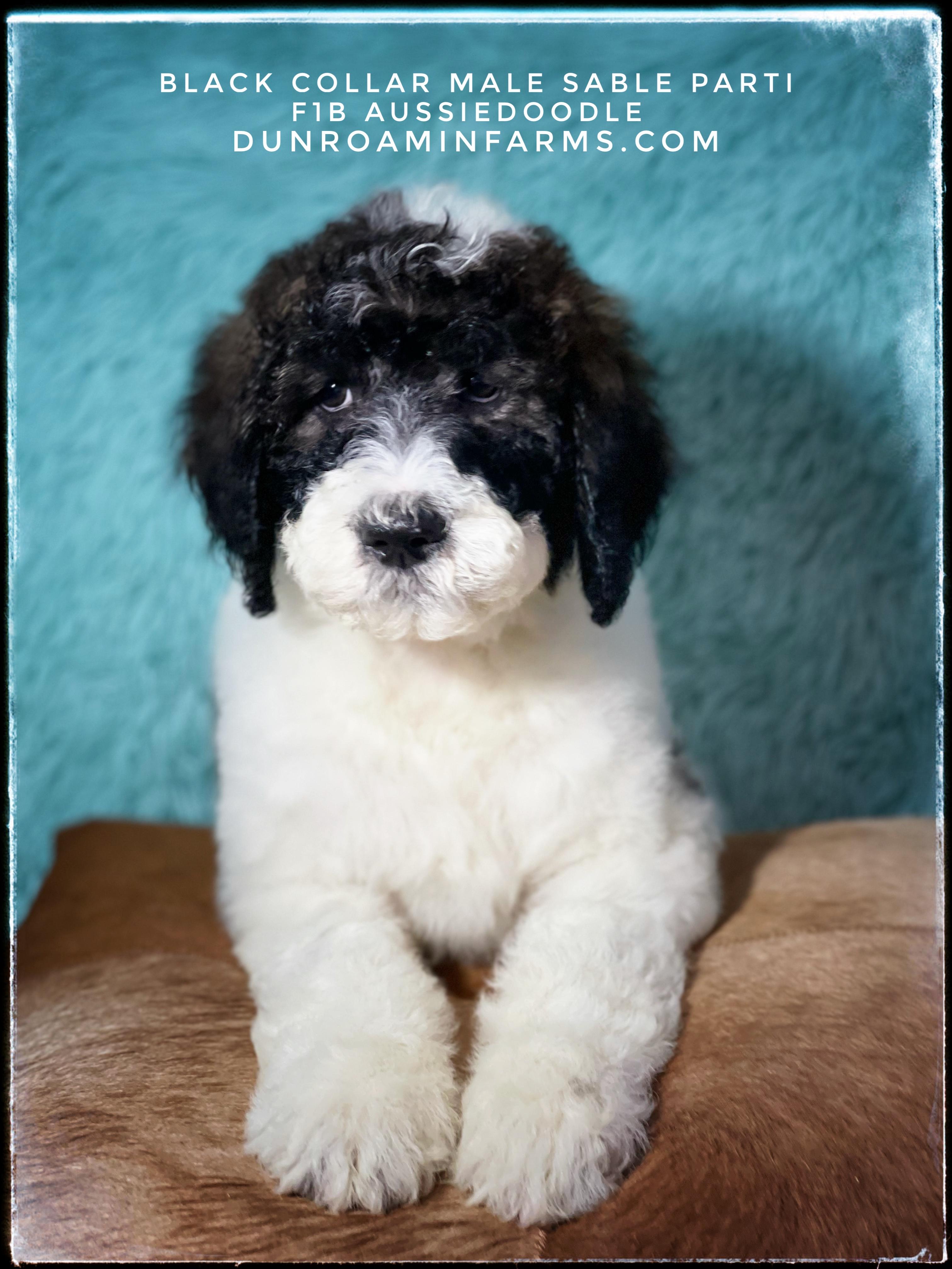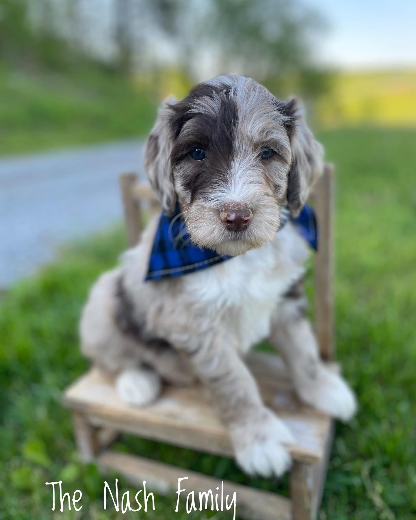 Aussiedoodle puppies include blue merle, red merle, black tri-color, and red tri-color. Colors will vary depending on the parent dogs.