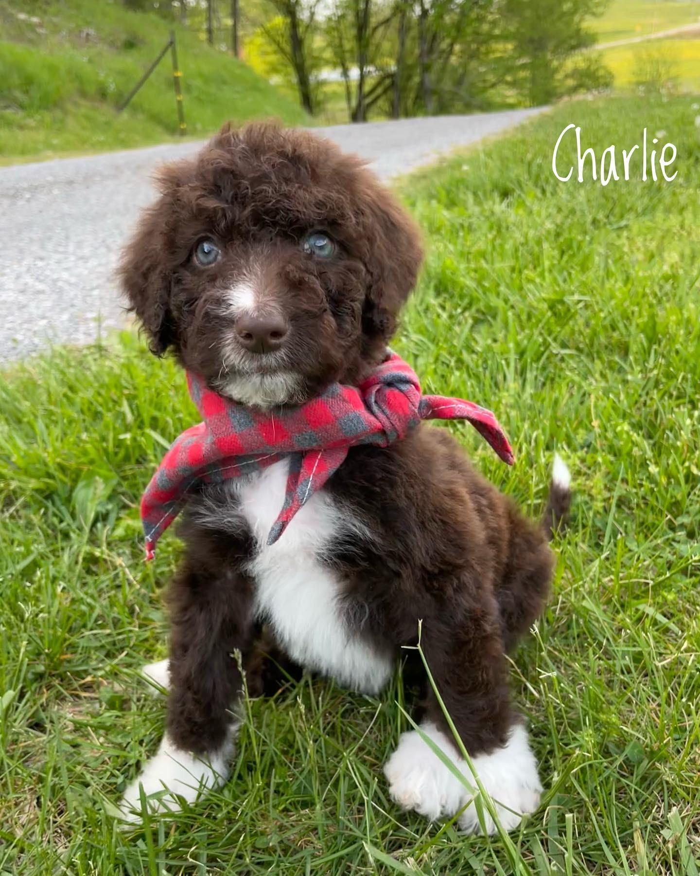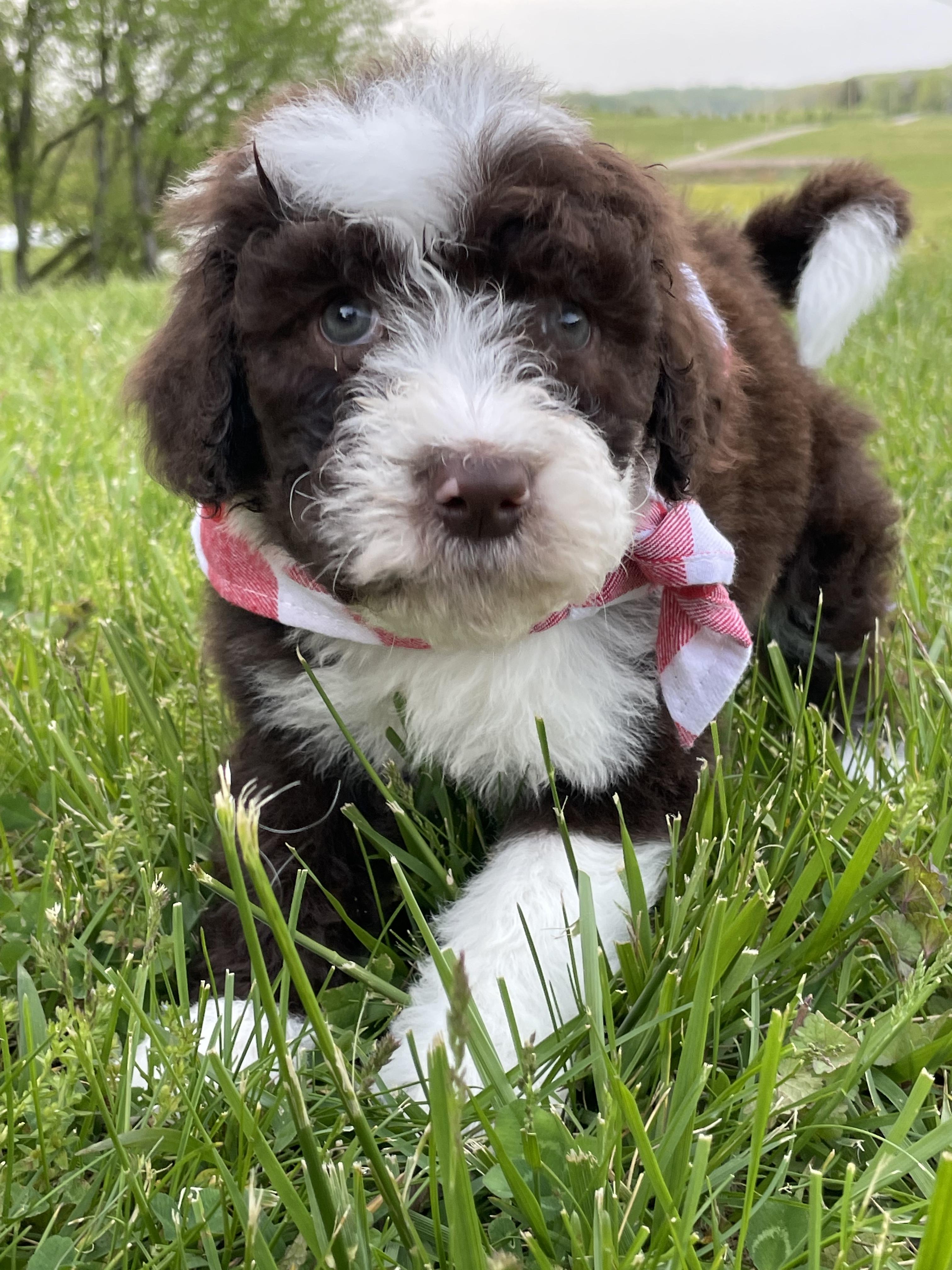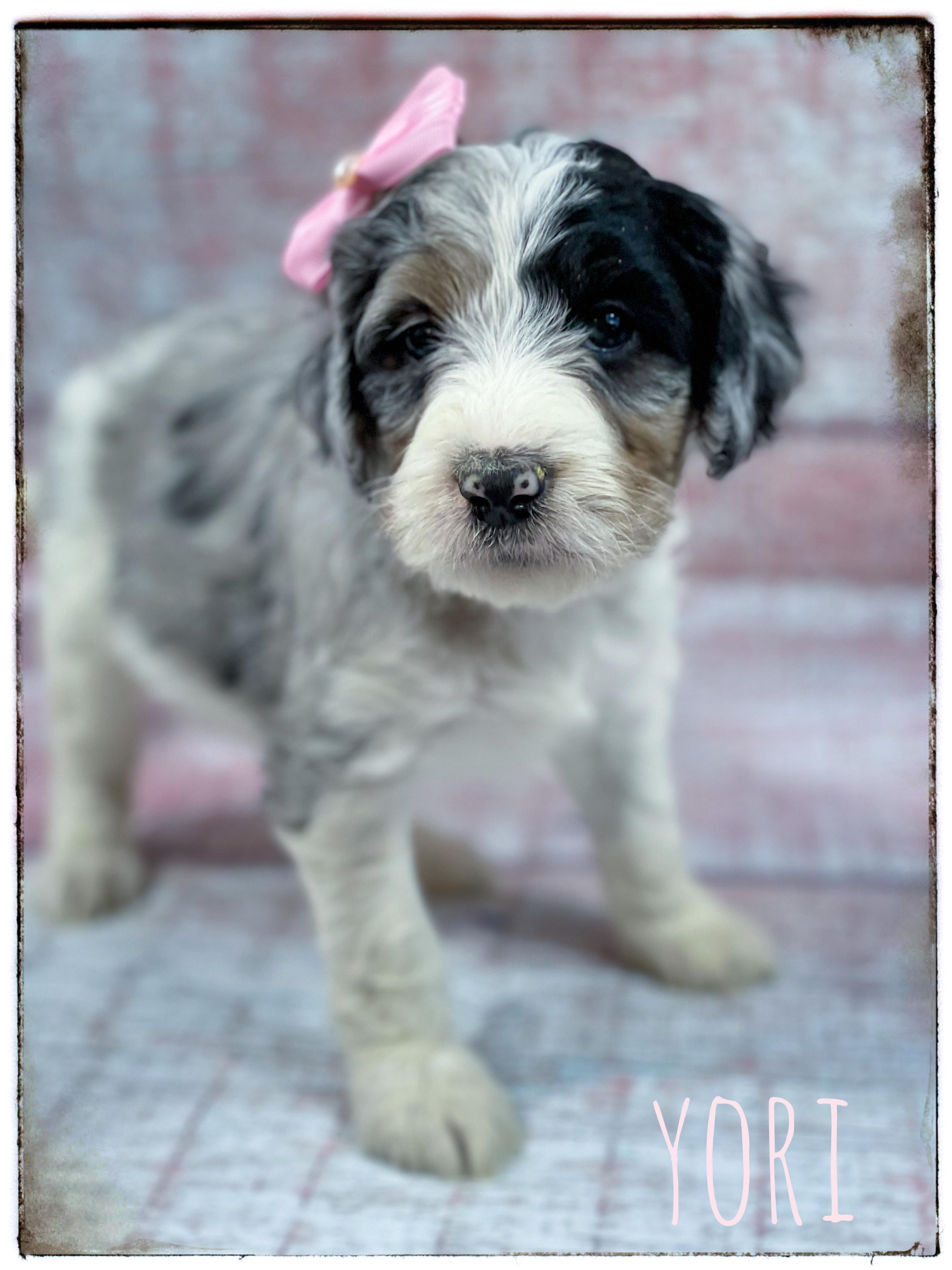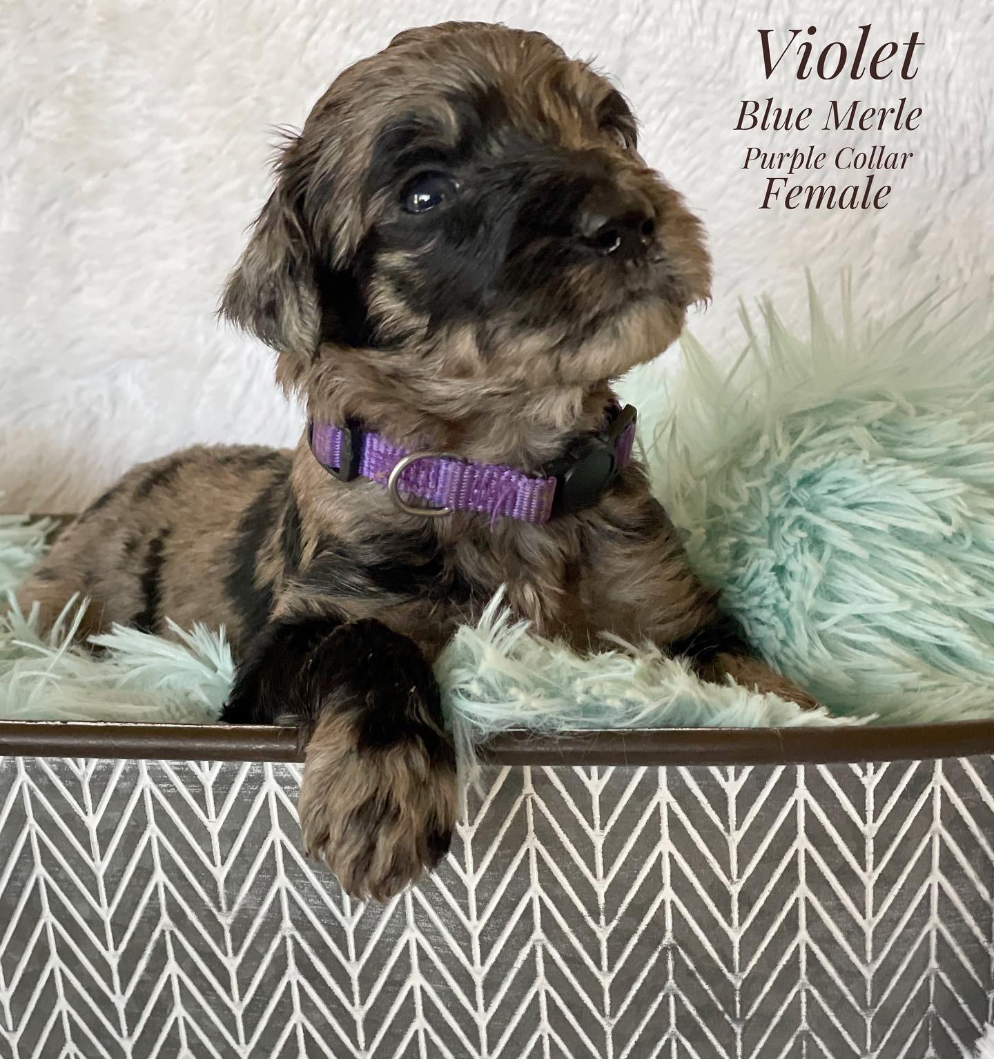 Aussiedoodle puppies include blue merle, red merle, black tri-color, and red tri-color. Colors will vary depending on the parent dogs.