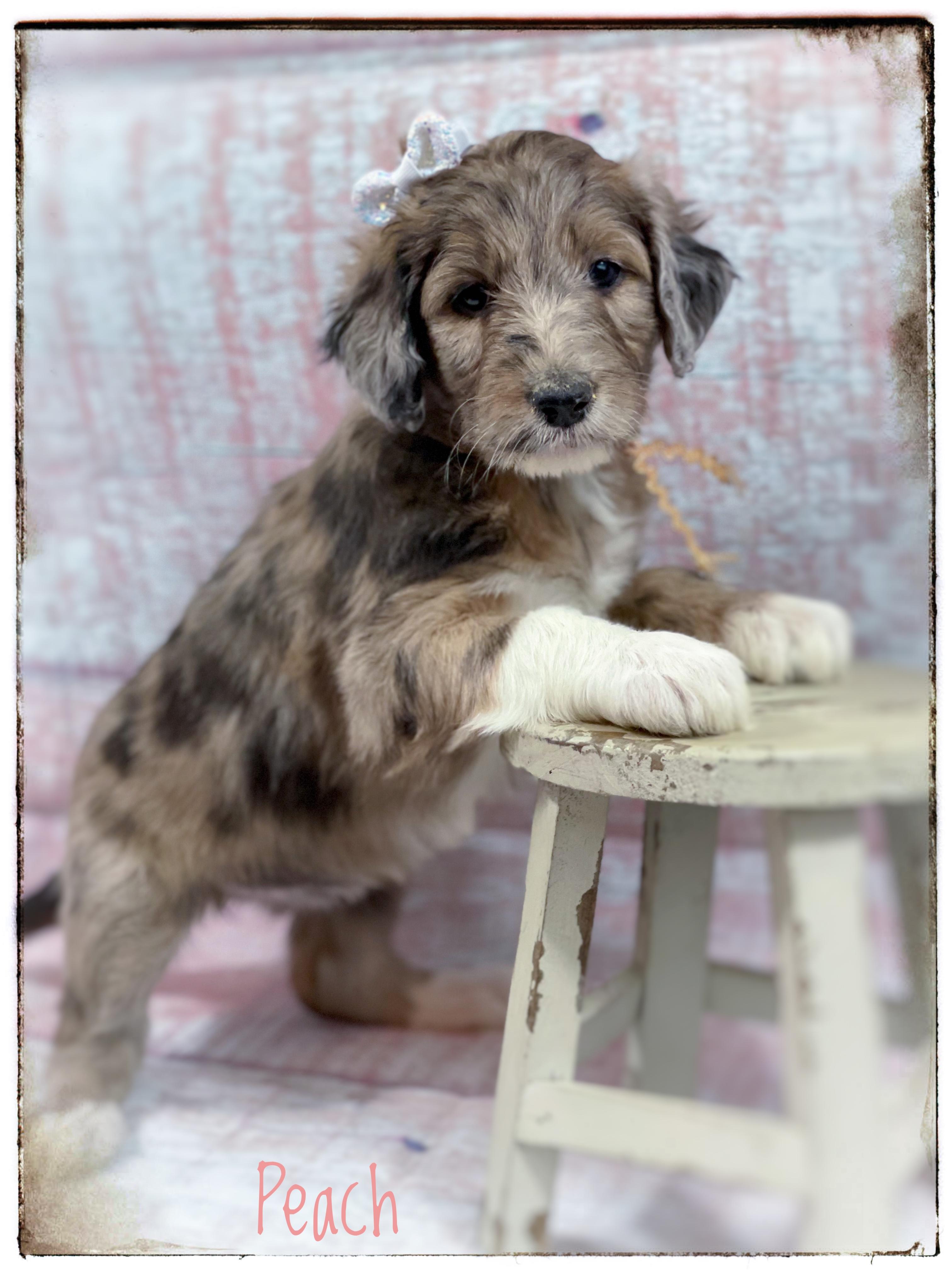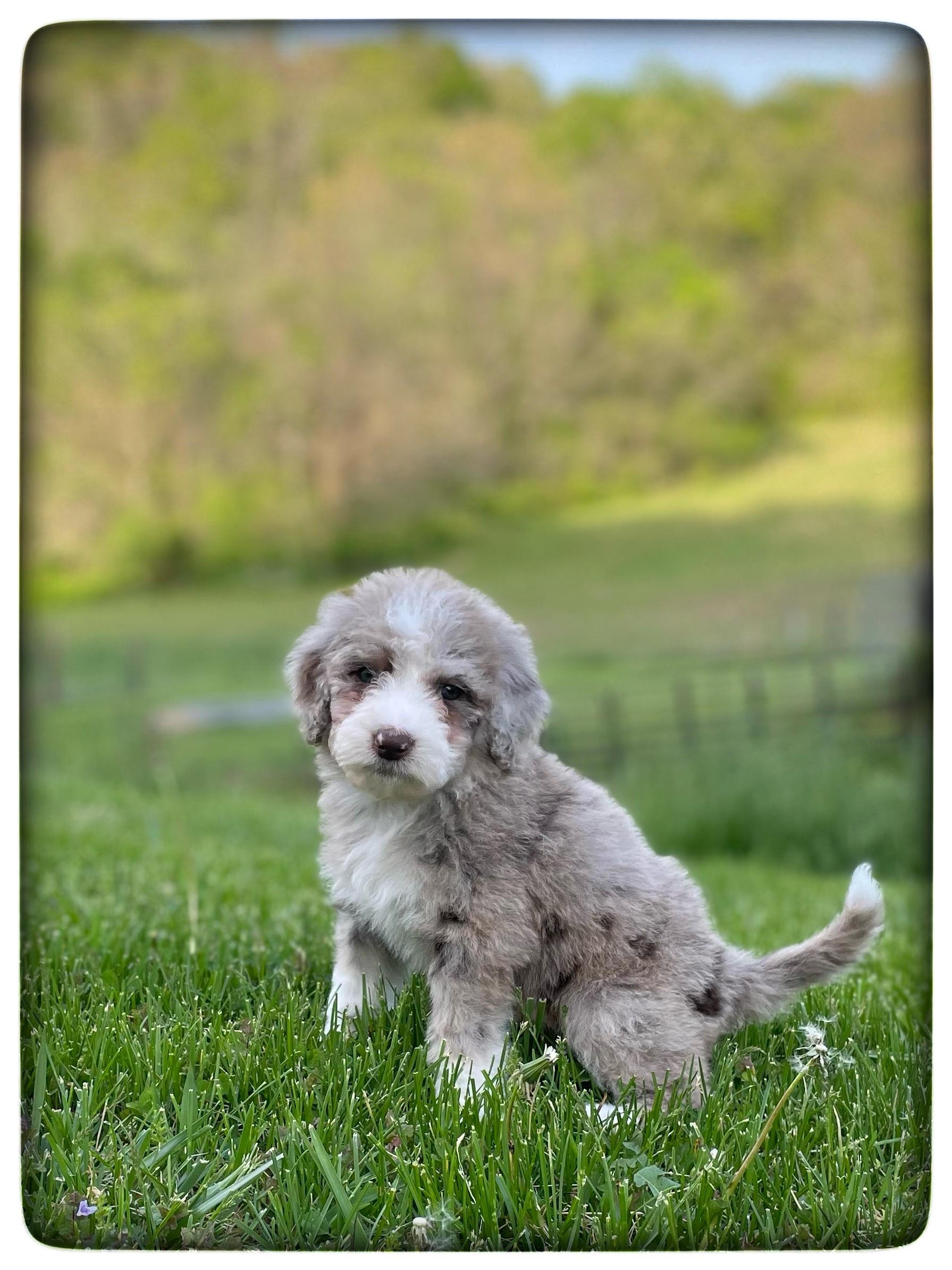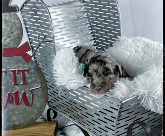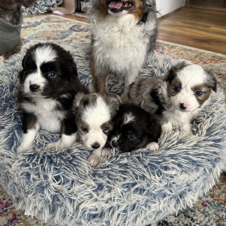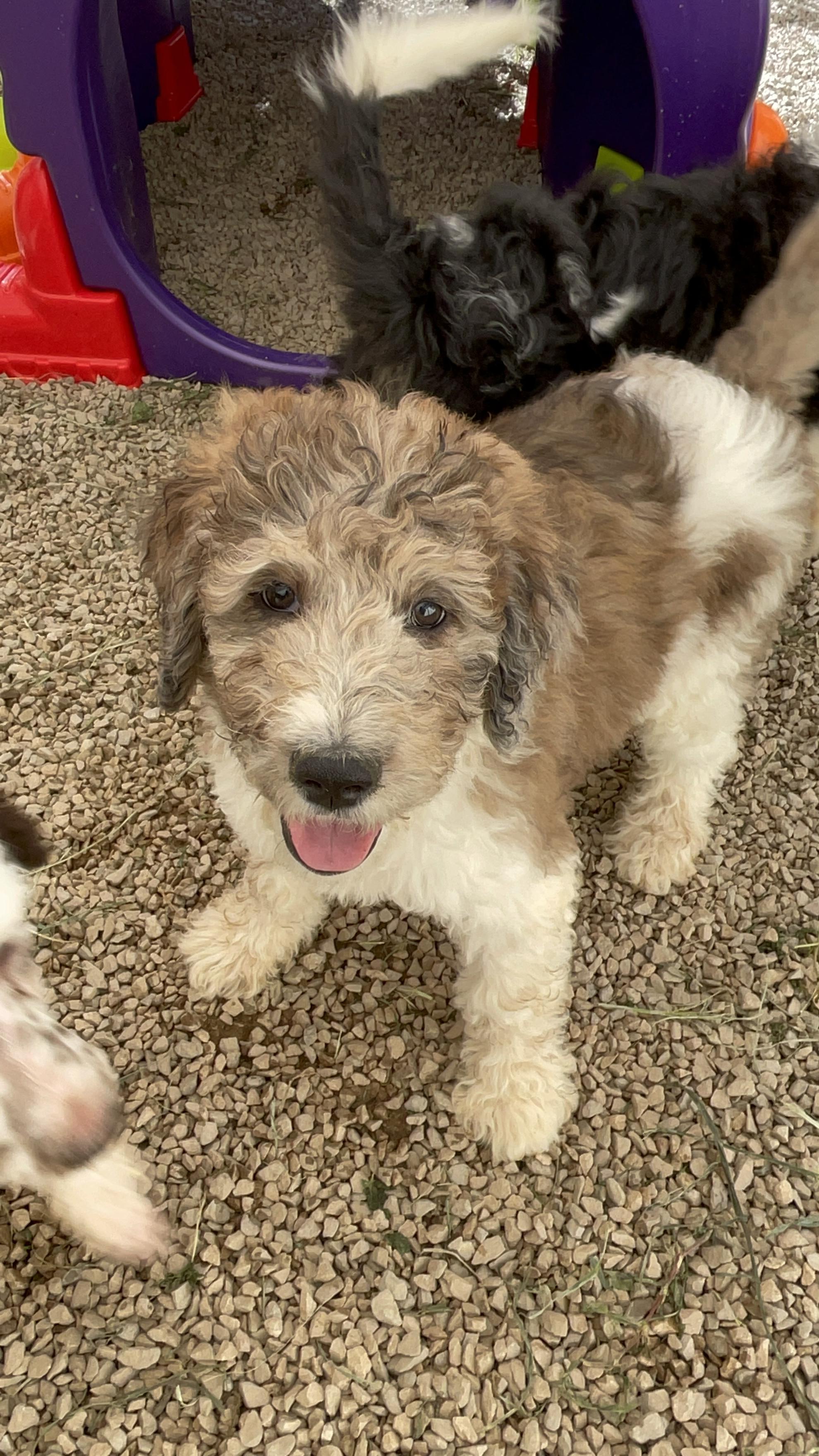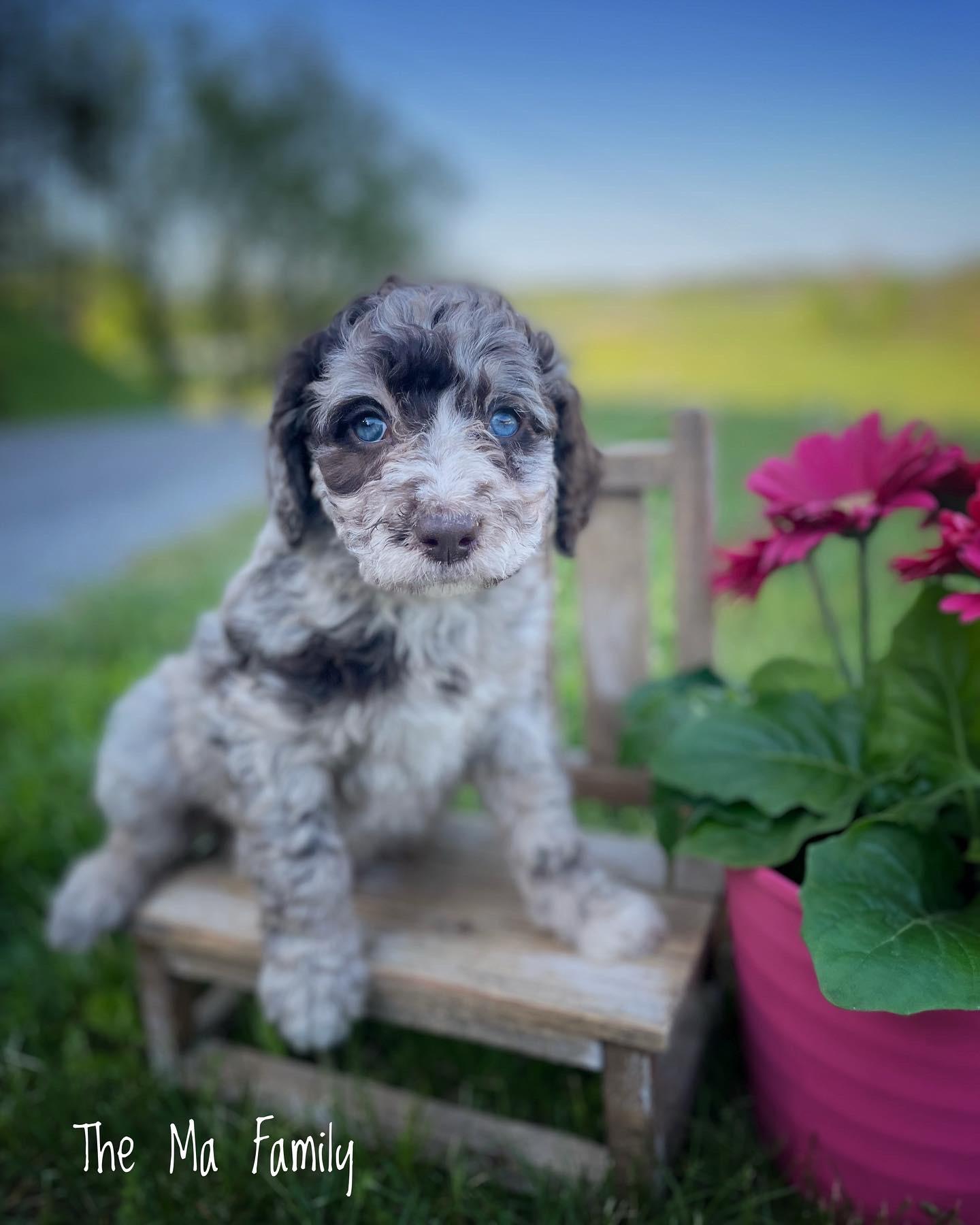 Our Aussiedoodle puppies include blue merle, red merle, black tri-color, and red tri-color. Colors will vary depending on the parent dogs.