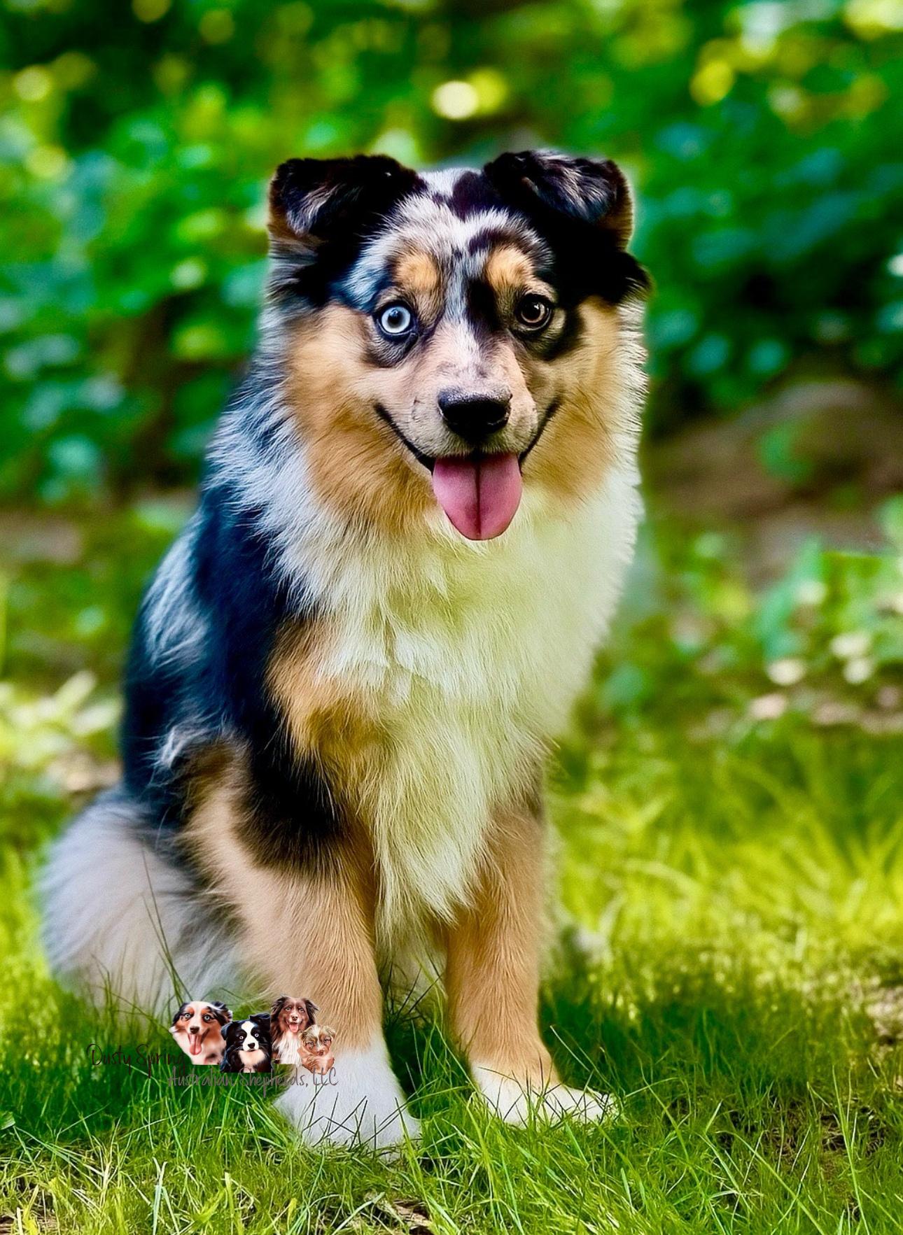 Our Miniature Australian Shepherd puppies include blue merle, black tri, red tri, and red merle. Toy Australian Shepherd puppies include black tri, blue merle, red merle, and red tri. Colors will vary depending on the parent dogs.