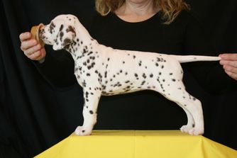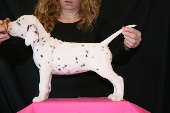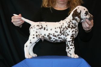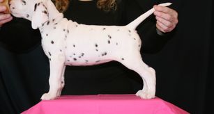 Hazel has beautiful structure and movement. She is an excellent representation of what a Dalmatian breed standard is She has received her AKC Grand Championship. Her temperament is outstanding and she has never shown signs of shyness, nervousness, aggression or fear. She is confident and well mannered. She is in excellent health and has passed and received her CHIC with OFA (Orthopedic Foundation for Animals).