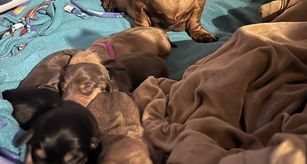 Our puppies include red, chocolate and tan, and black and tan. Colors will vary depending on the parent dogs.