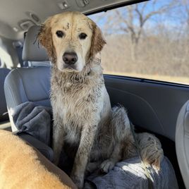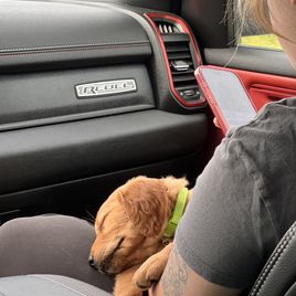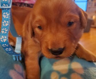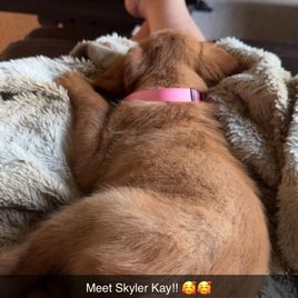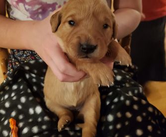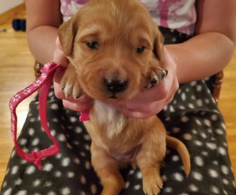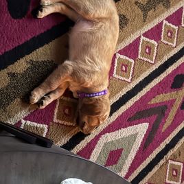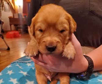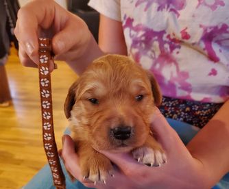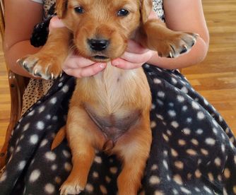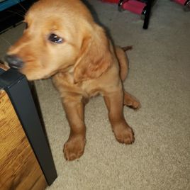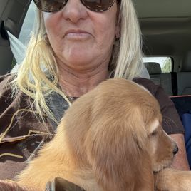 Working with Elizabeth was wonderful. She answered my questions quickly and honestly. She met me on the way home from a conference which was super convienient for me. Puppy has settled in nicely. She slept in her kennel all night with no accidents. She loves our older GR Jenny! Very playful and smart! She has a good nose on her!