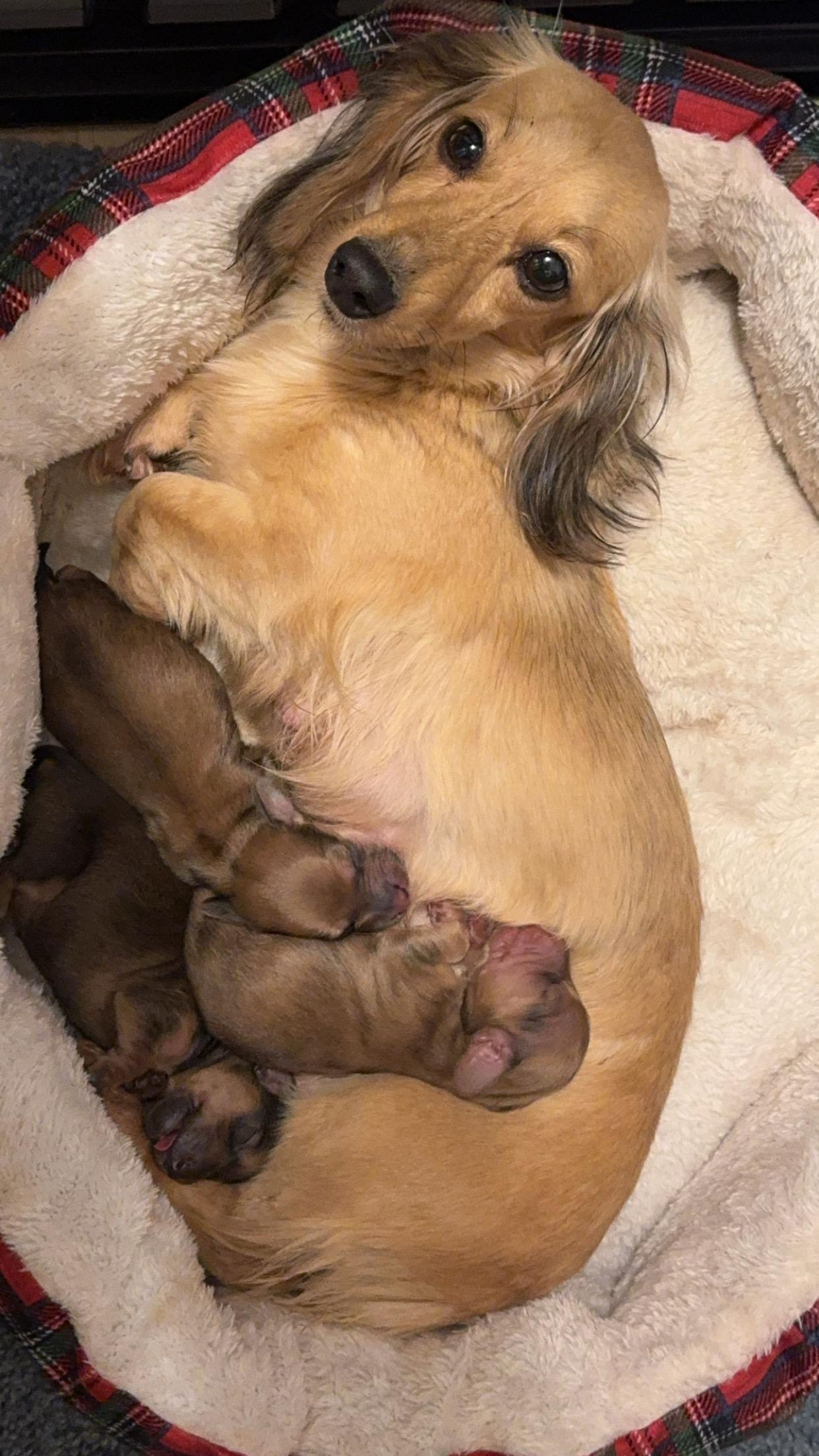 Breeding has been my passion for 20 years and counting. It all started when I started working at a veterinarian clinic right out of high school. The veterinarian was a reproductive vet and a breeder. I learned the ends and outs of everything, from the whole birthing process, doing AI’s (artificial insemination) to delivering puppies through c sections. I mentored under her for several years. I was a veterinarian technician for a total of12 years. I started out breeding Great Danes. Danes short lifespan made it so hard on the heart… So I switched to my favorite breed, the Miniature Dachshund!!