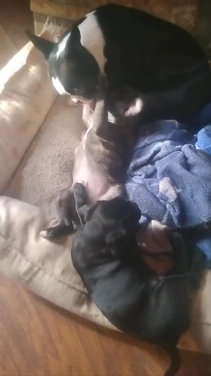 My program is a simple one. I breed my dogs in my home. They are around family and friends and are used to a home life. They are loved as one of our own until they go to their new owners.We also breed Buggs which is Boston/Pug mix. As you can see, Our boston is pictured with the sire(the black pug Wicket).