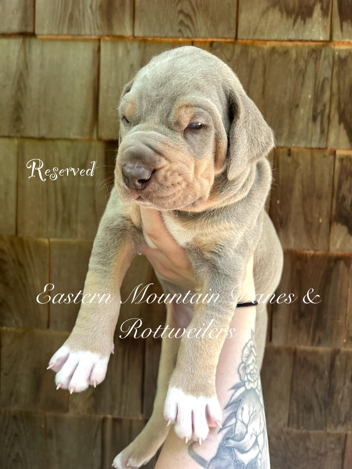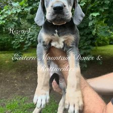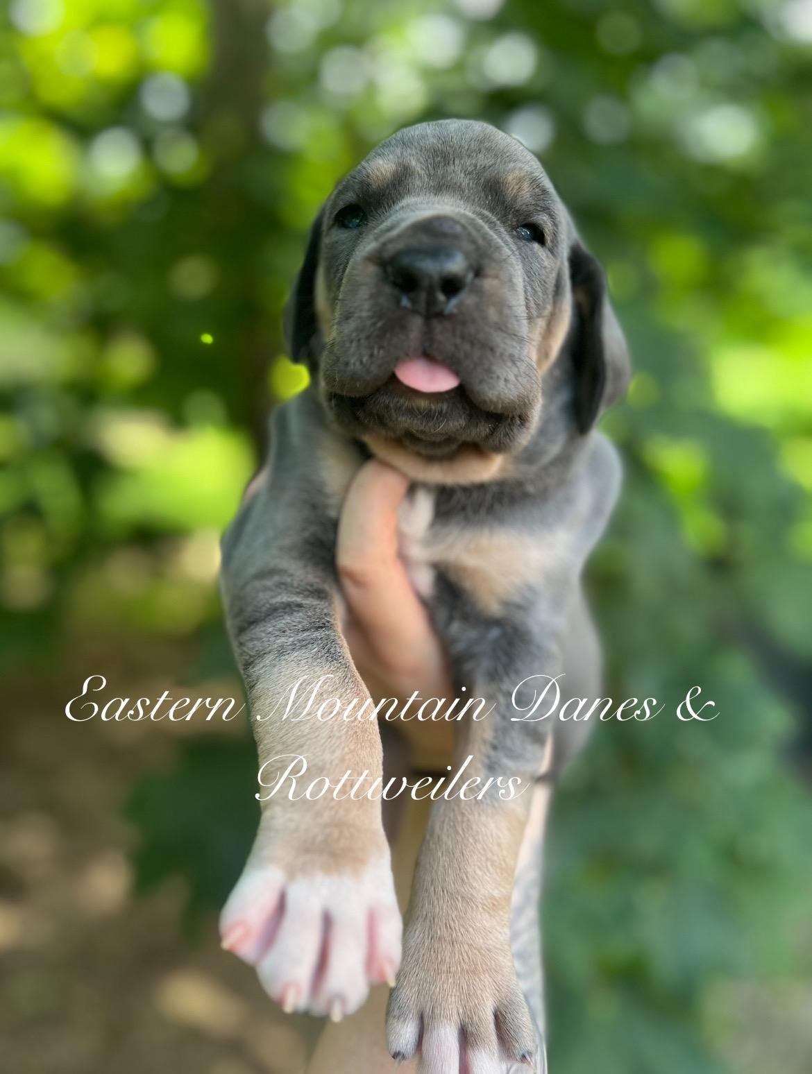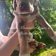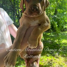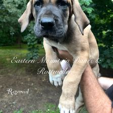 I'm Logan P., the breeder behind Eastern Mountain Danes & Rottweilers located in Hermon, ME. All of our dogs are raised in our home alongside our family. We breed both traditional and non-traditional colors, however, all breeding dogs are selected for structure, personality, and health.