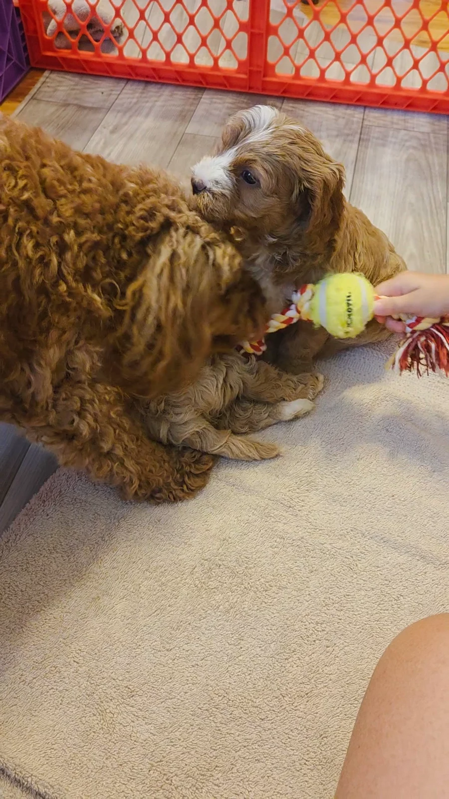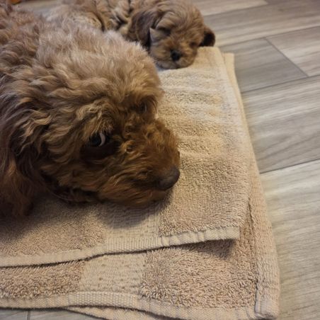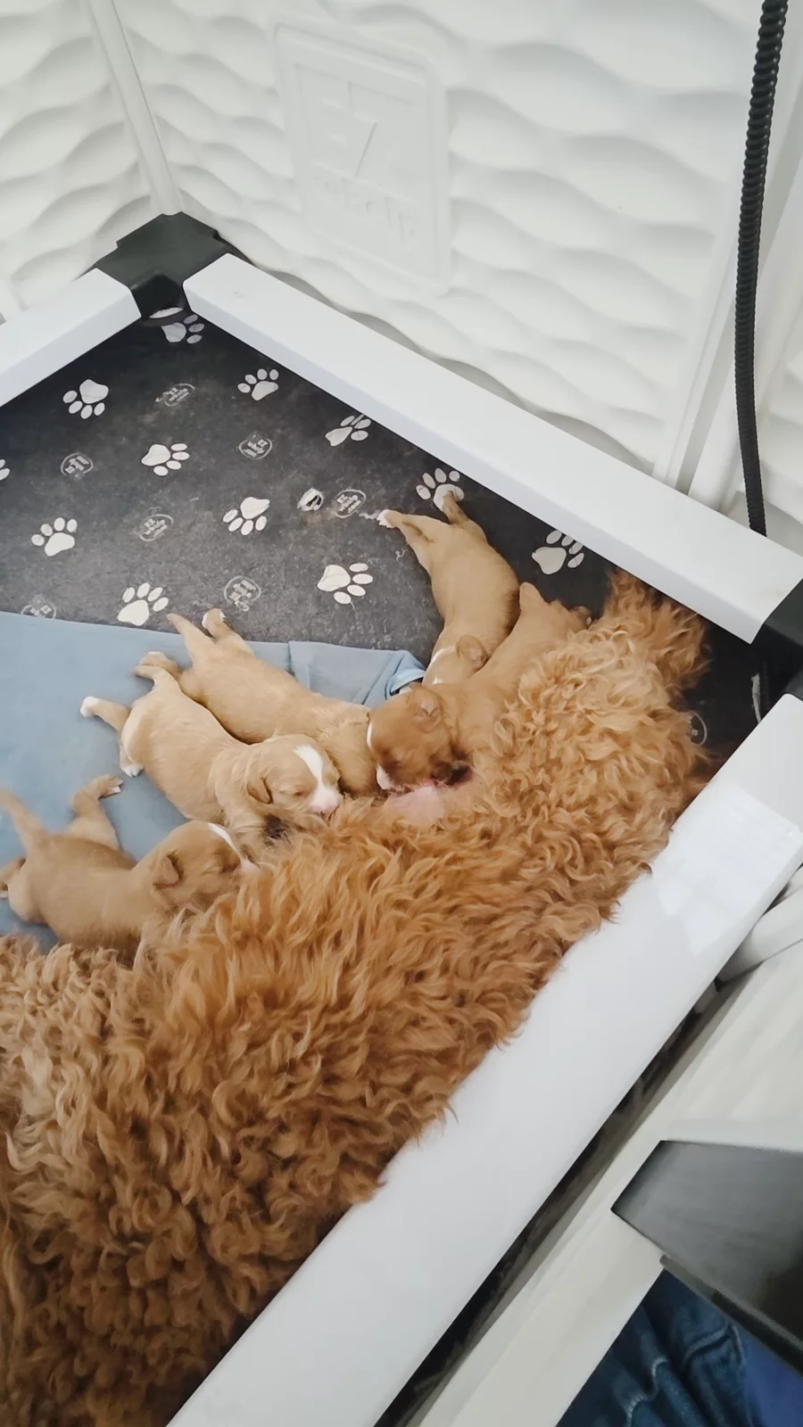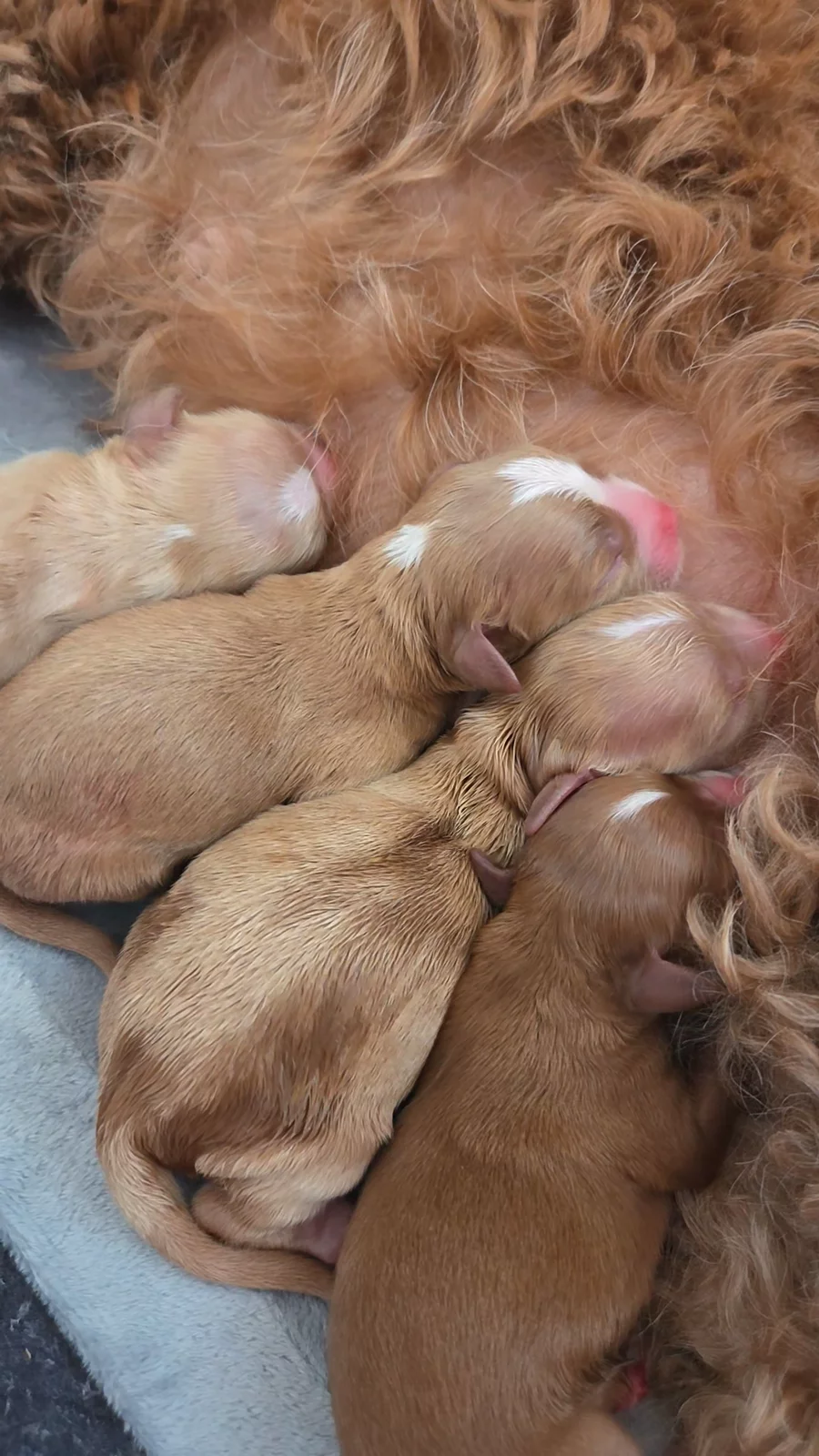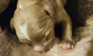 Elle is a CKC registered Miniature Poodle. She is an intense red color. She loves attention and is persistent when she wants you to pet her. Elle is an AMAZING mama. She is attentive to their grooming needs. According to the weights of the puppies, she's providing an ample amount of milk for all!!