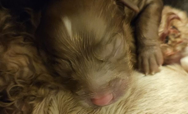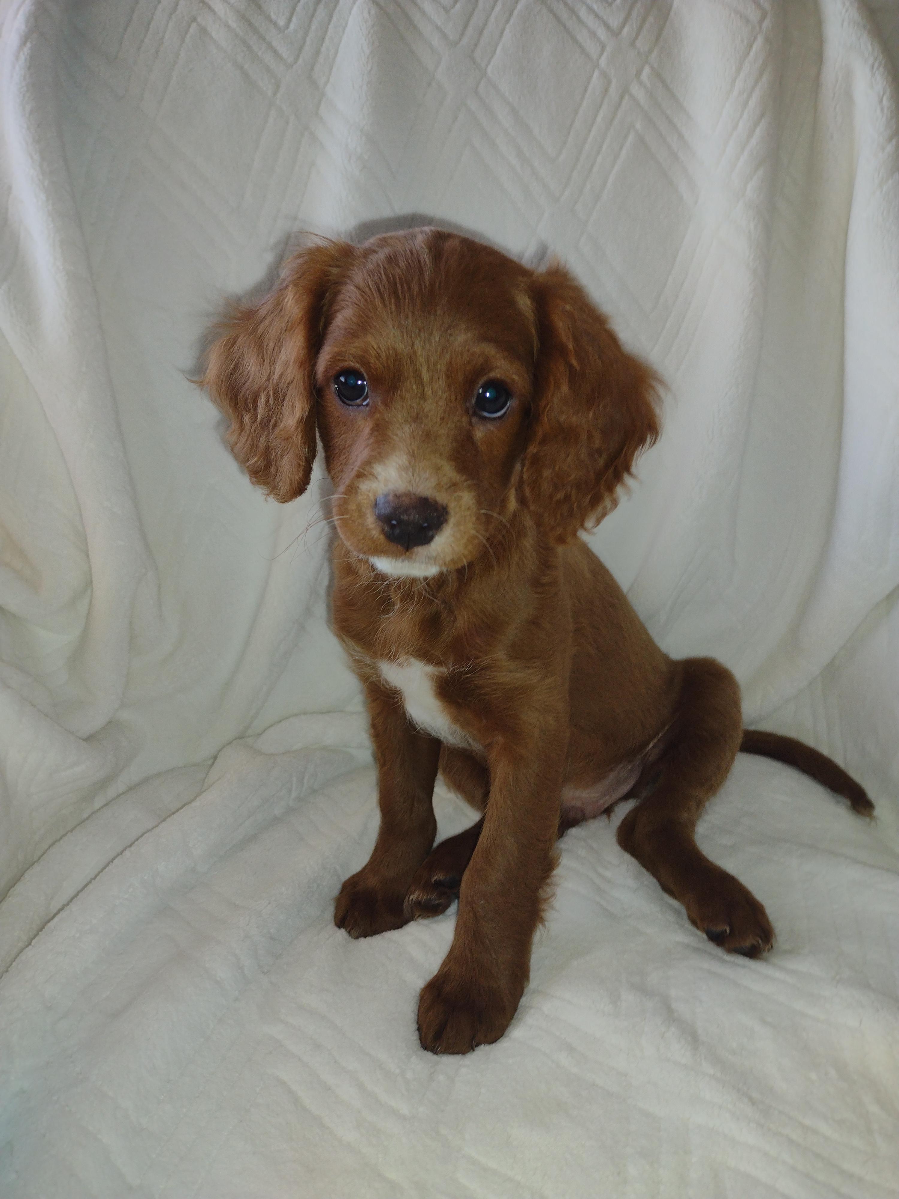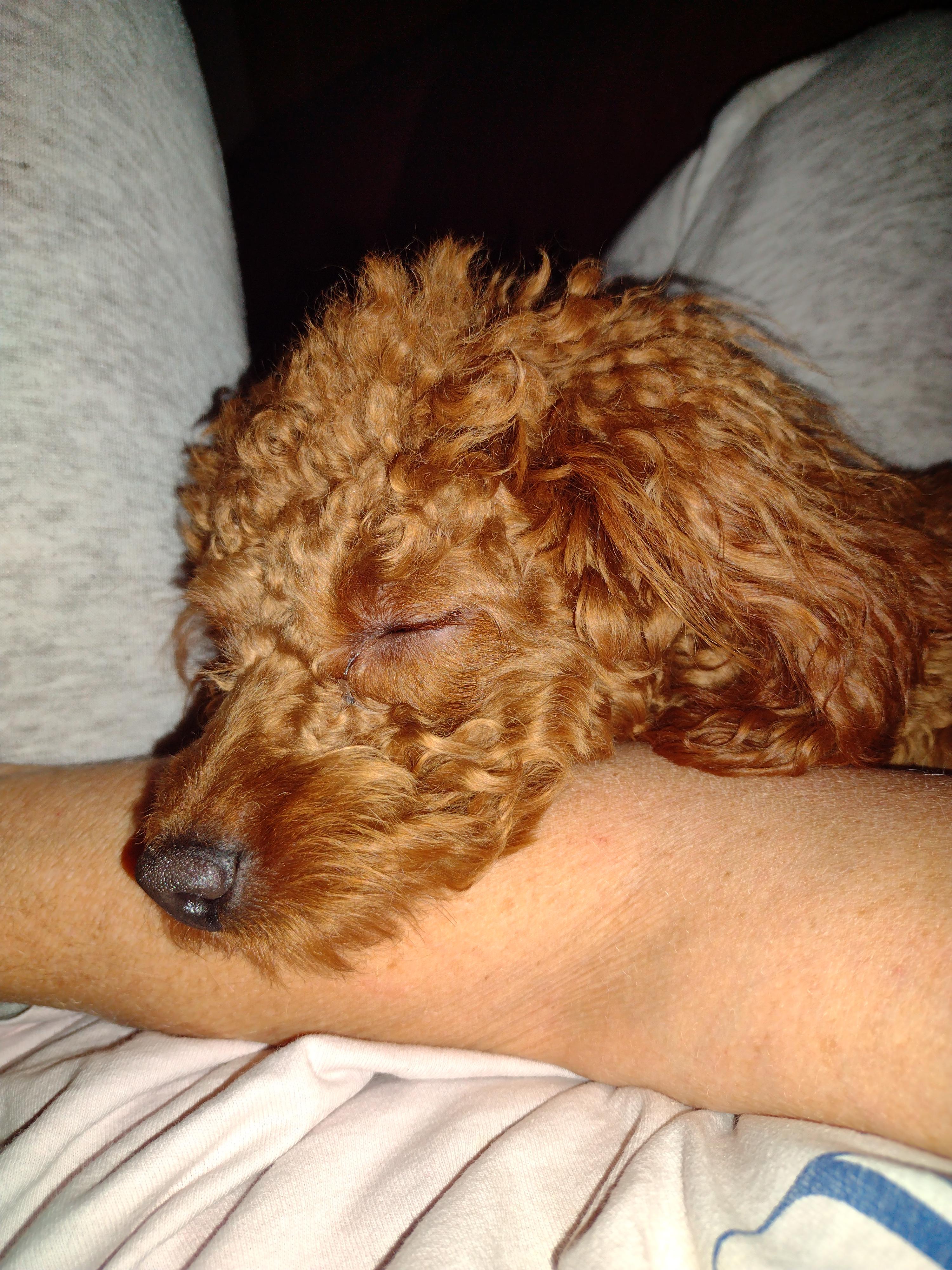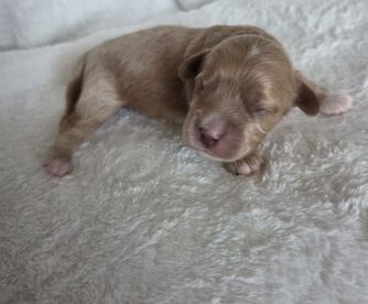 Elle is a CKC registered Miniature Poodle. She is an intense red color. She loves attention and is persistent when she wants you to pet her. Elle is an AMAZING mama. She is attentive to their grooming needs. According to the weights of the puppies, she's providing an ample amount of milk for all!!