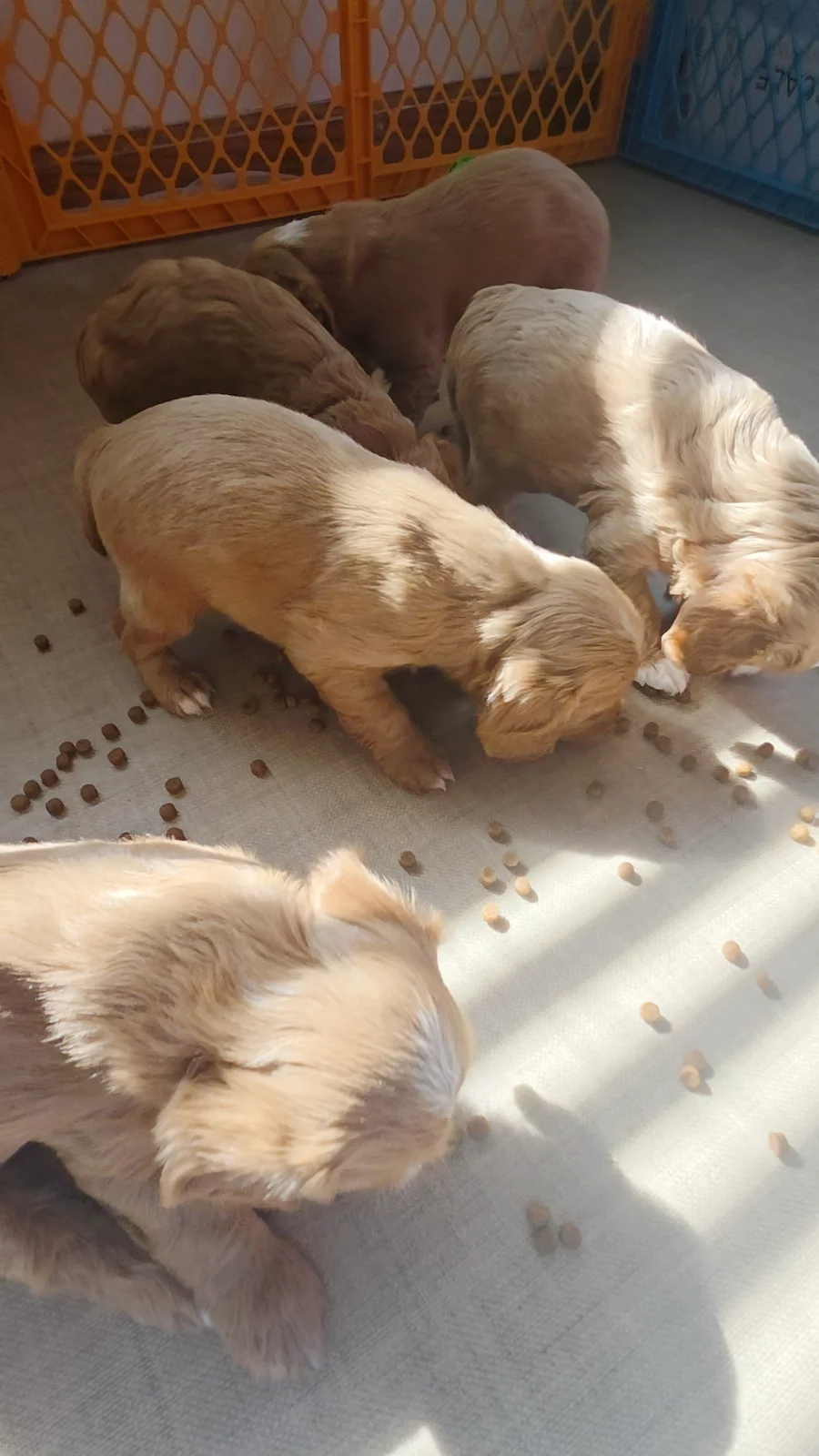 It's time to try some crunchy food! We're almost 5 weeks old!! Our teeth & tummies are ready for real food. I start my puppies on Eukanuba small breed puppy food because they are such tiny bites. As we finish the bag, I'll transition them to larger kibble. Look out world! Here we come!!