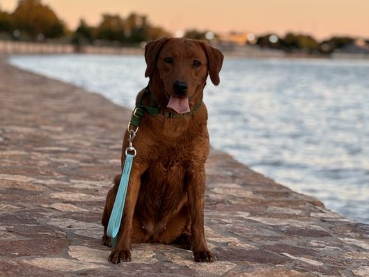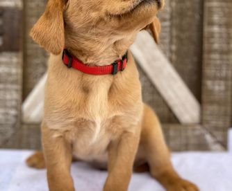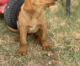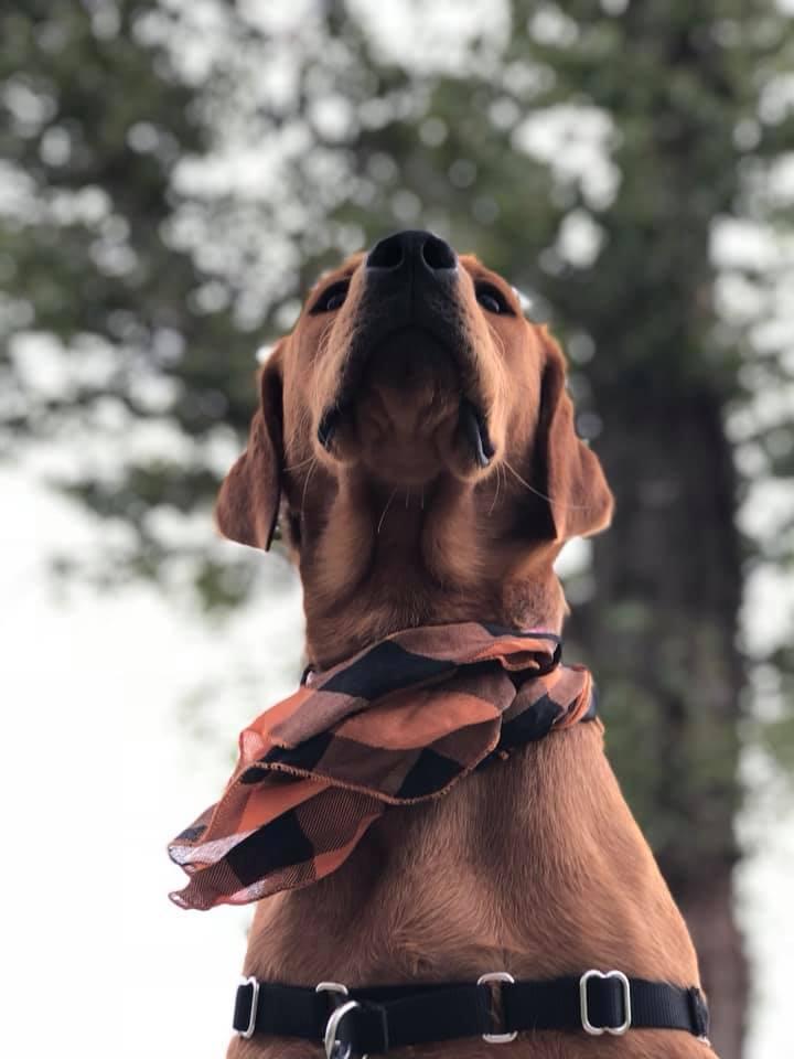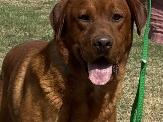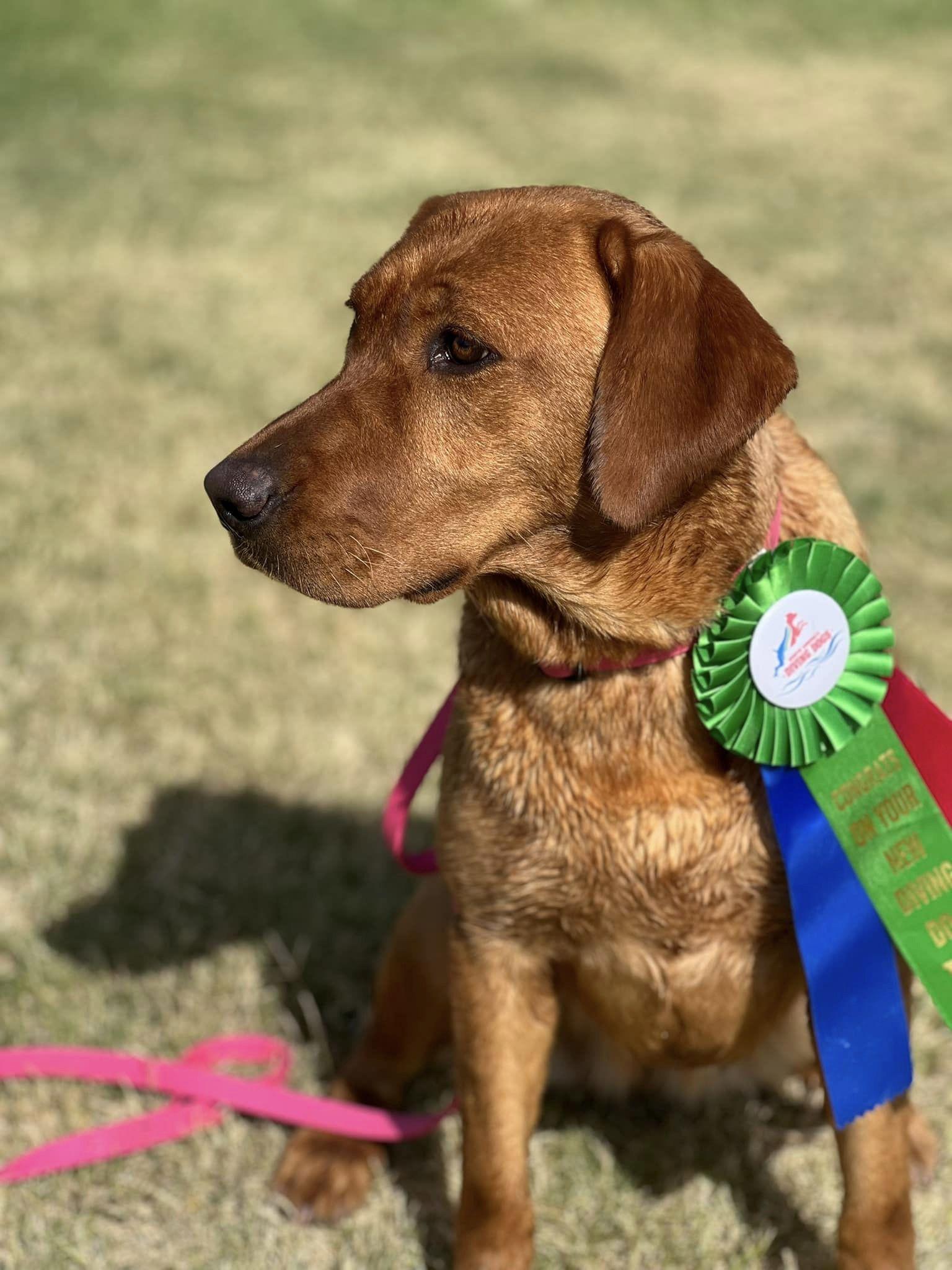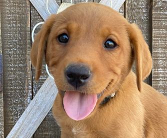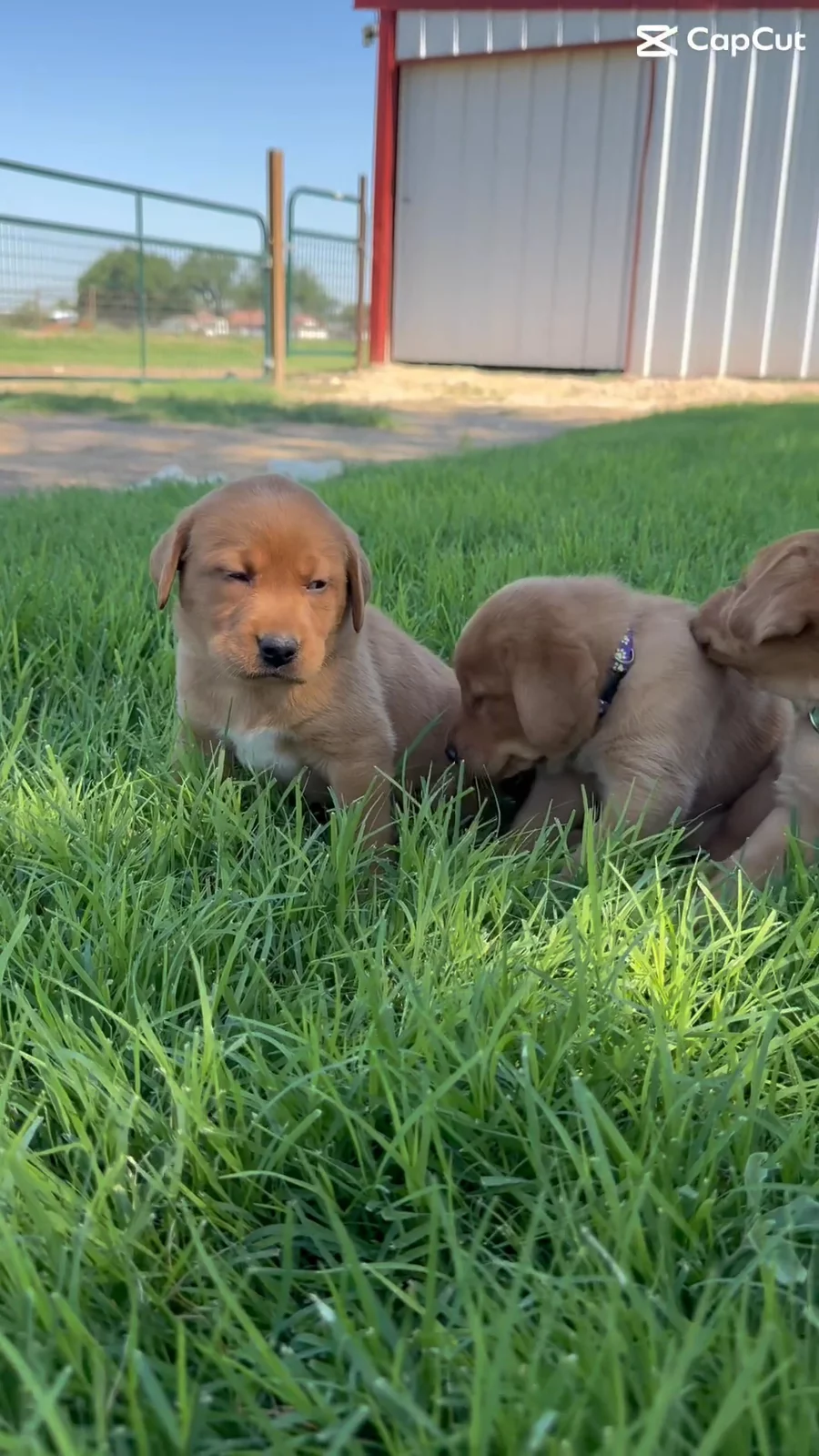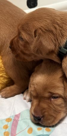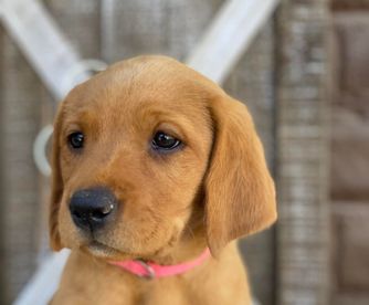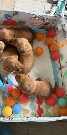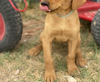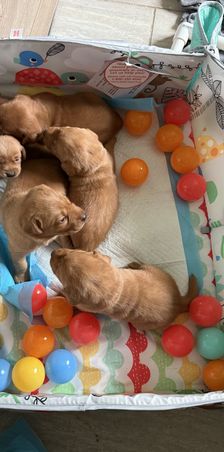 Rikka is gentle-natured and loves morning exploring around the farm, playing fetch in the lake, and belly rubs. Her calm, patient demeanor makes her wonderful around our kids. She is AKC registered with all recommended health clearances, including OFA certified hips graded excellent. She's a gorgeous fox red color!