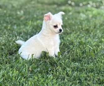 Gizmo is a tiny 3 pound, long haired apple head chihuahua. He is tri colored cream, white and blue. He’s well tempered and especially friendly.