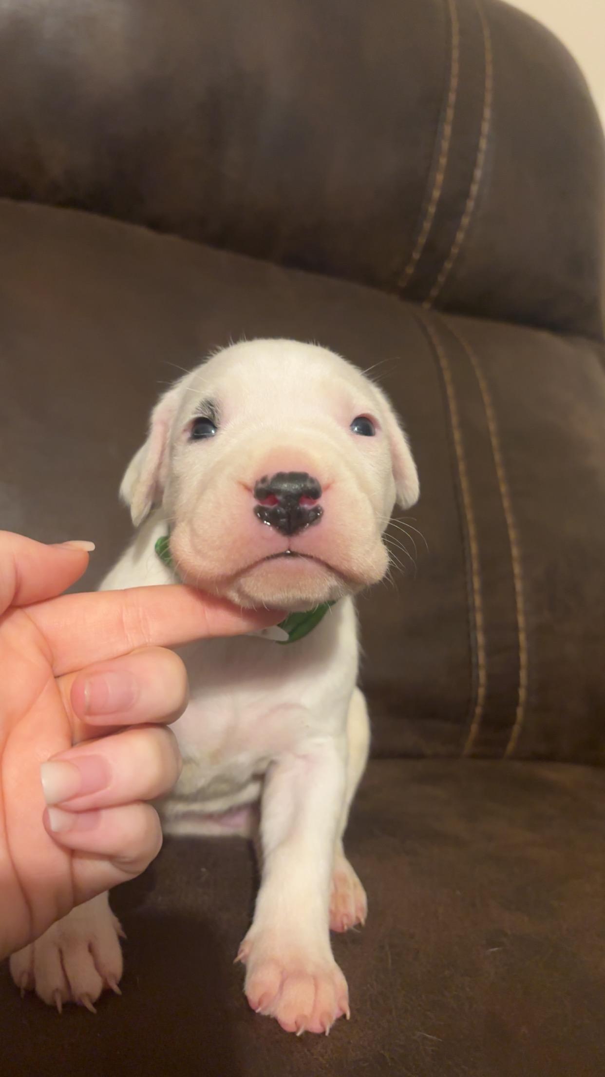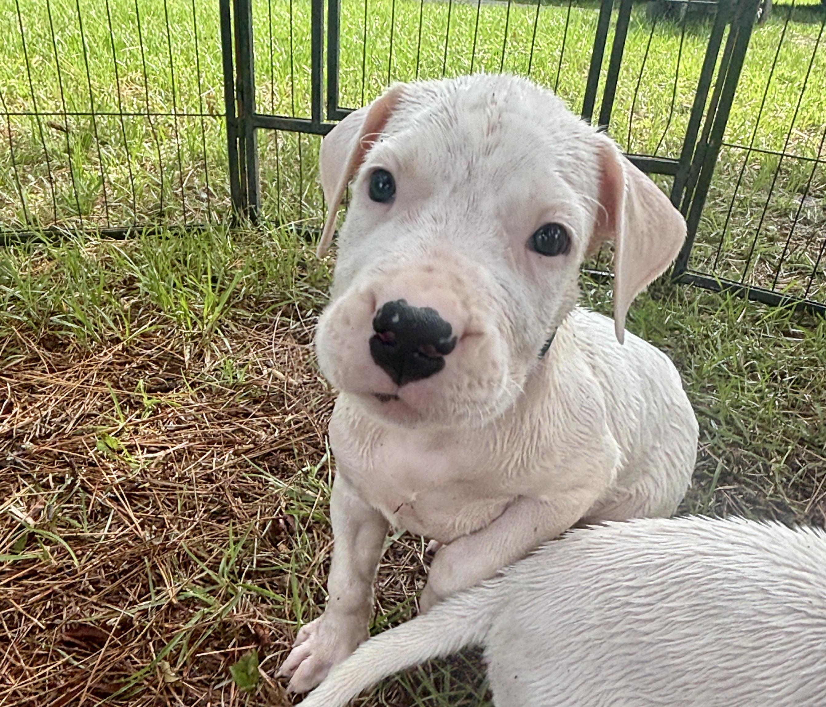 Our French Bulldog puppies include brindle and brindle and white. Dogo Argentino puppies are white. Colors will vary depending on the parent dogs.
