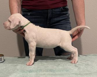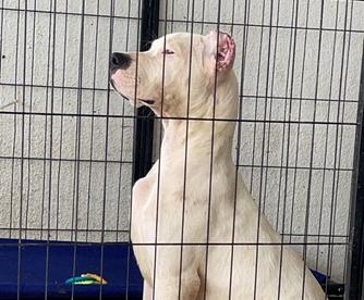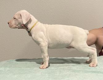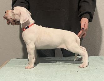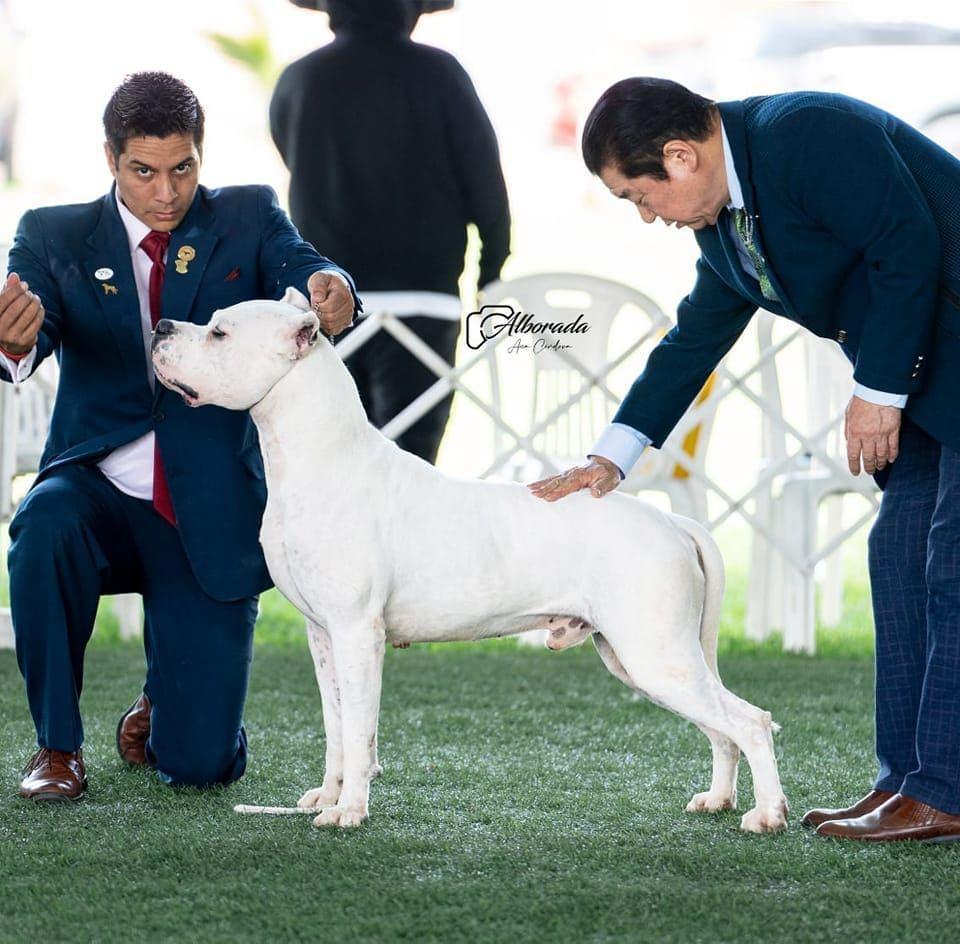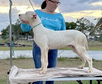 Flor was imported from Argentina after achieving her junior champion status, after arriving in the United States she obtained her AKC champion title and her Grand Champion title. Flor not only is a great representative of what the dogo should be visually but temperamentally as well. She likes to hunt, interacts well with other dogs in a pack and is a good family dog when she is at home.