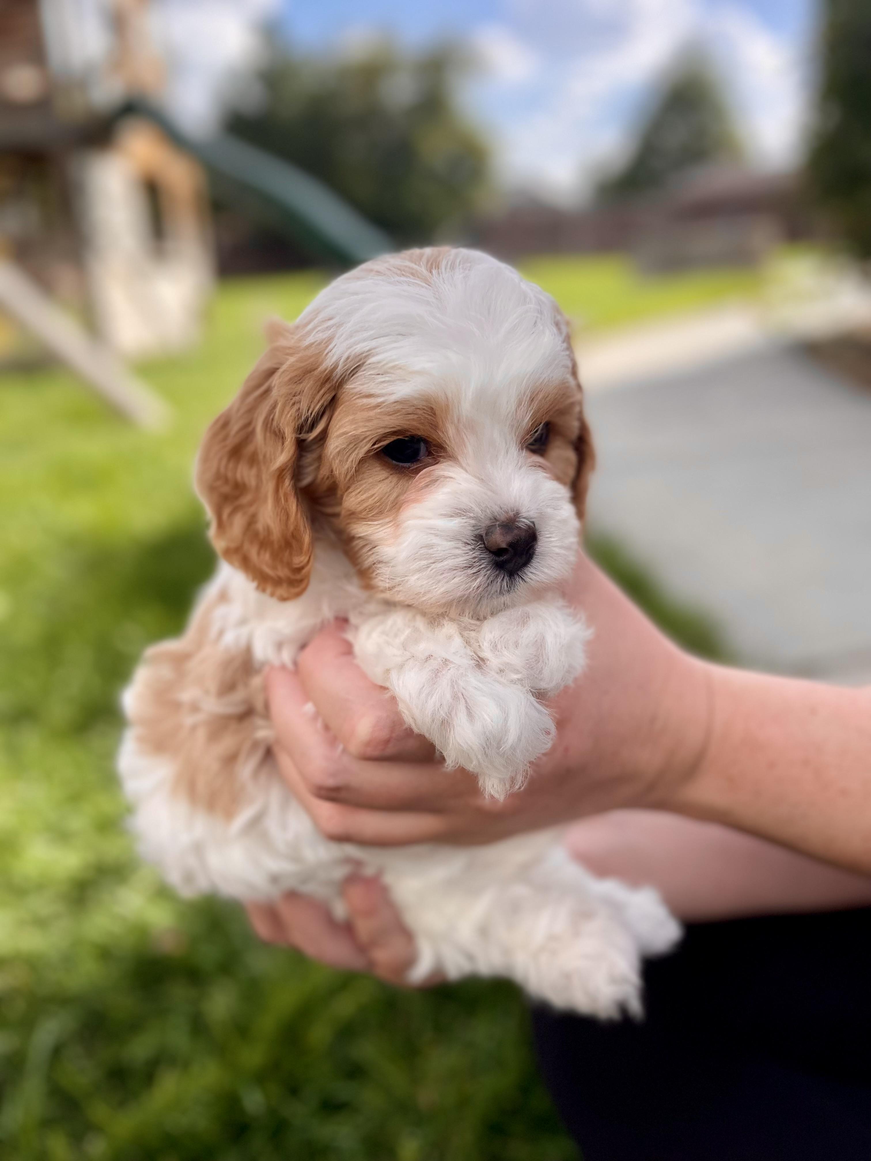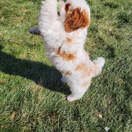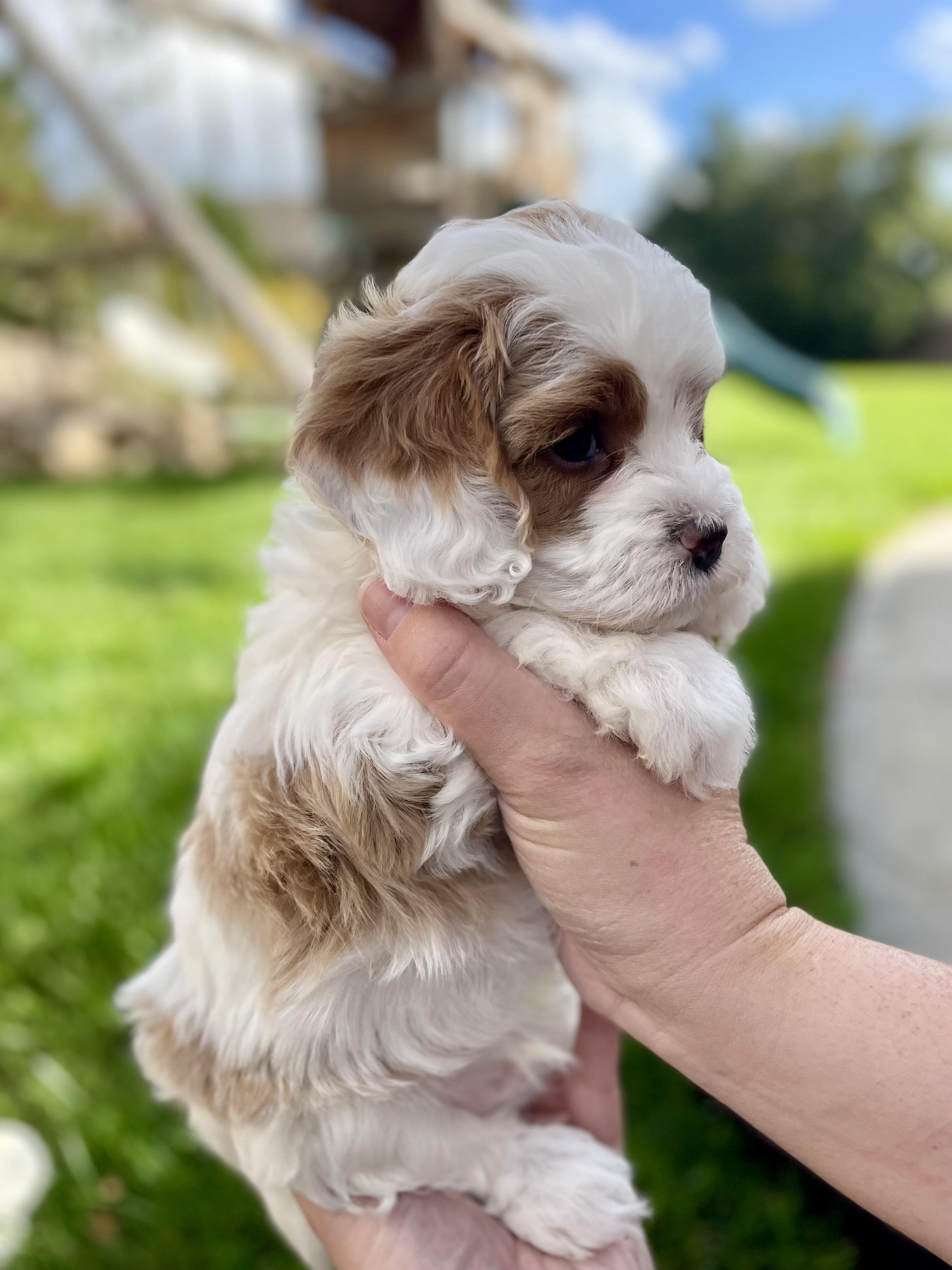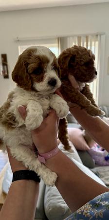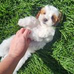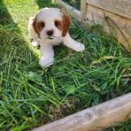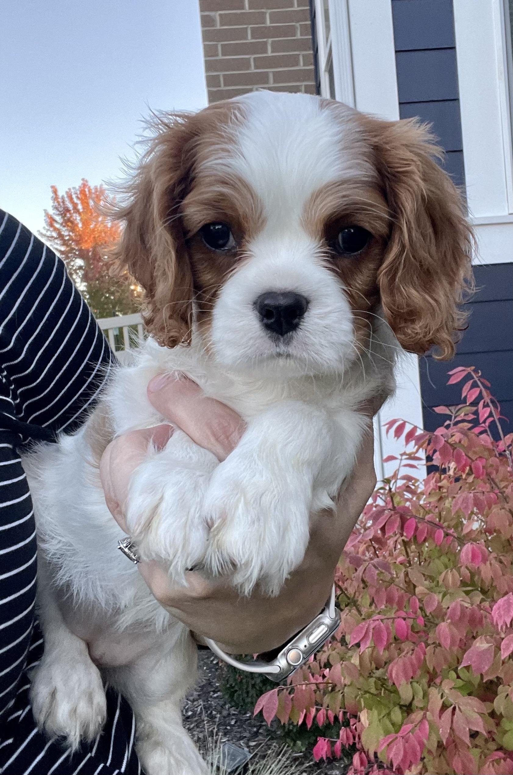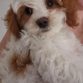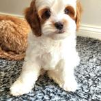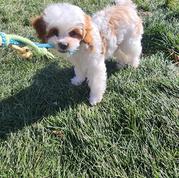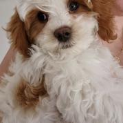 Our Cavapoo puppies include white, red, and blenheim. Cavalier King Charles Spaniel puppies are blenheim. Colors will vary depending on the parent dogs.