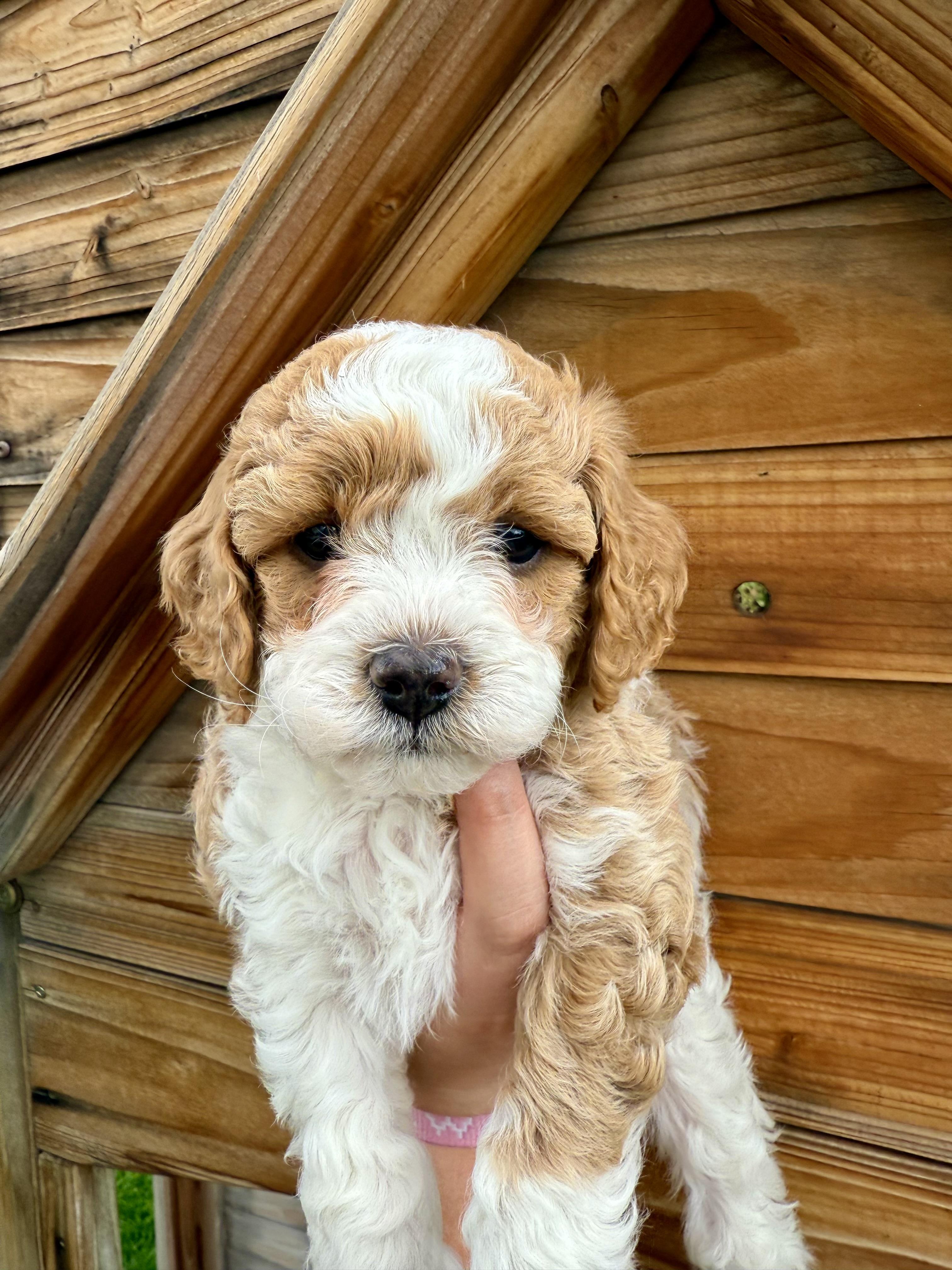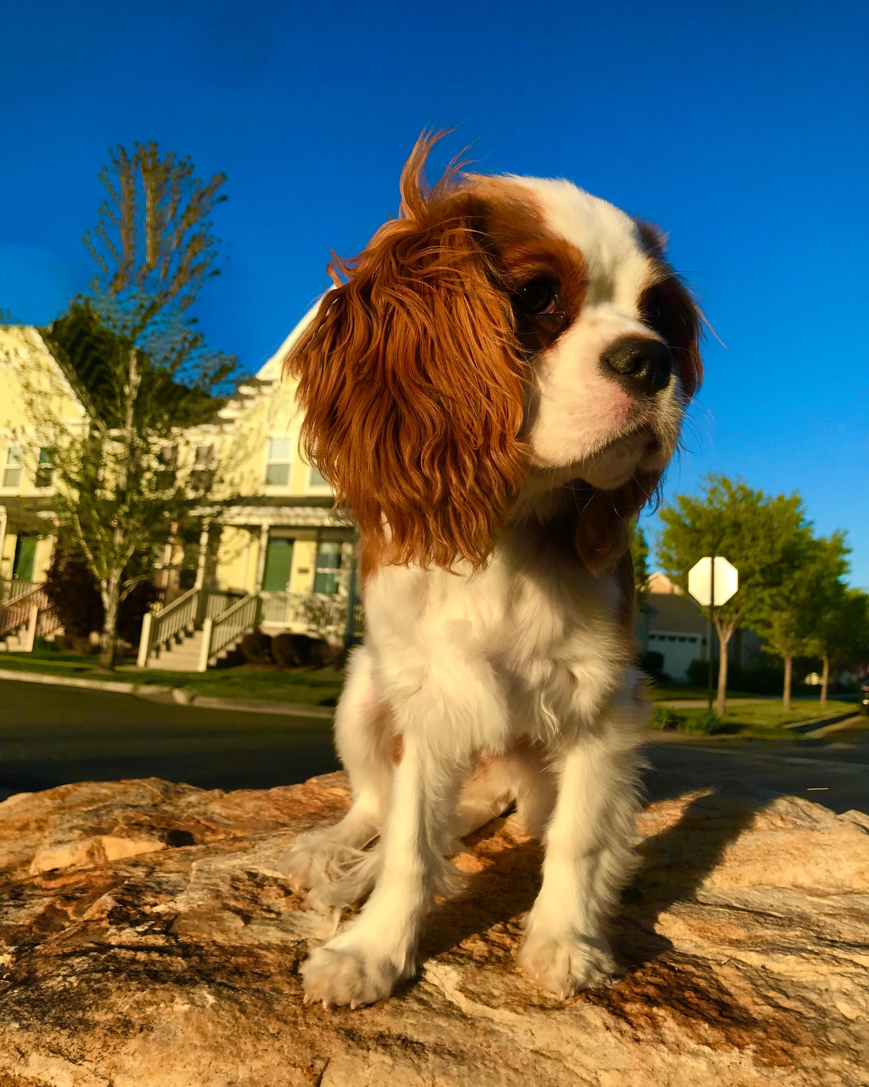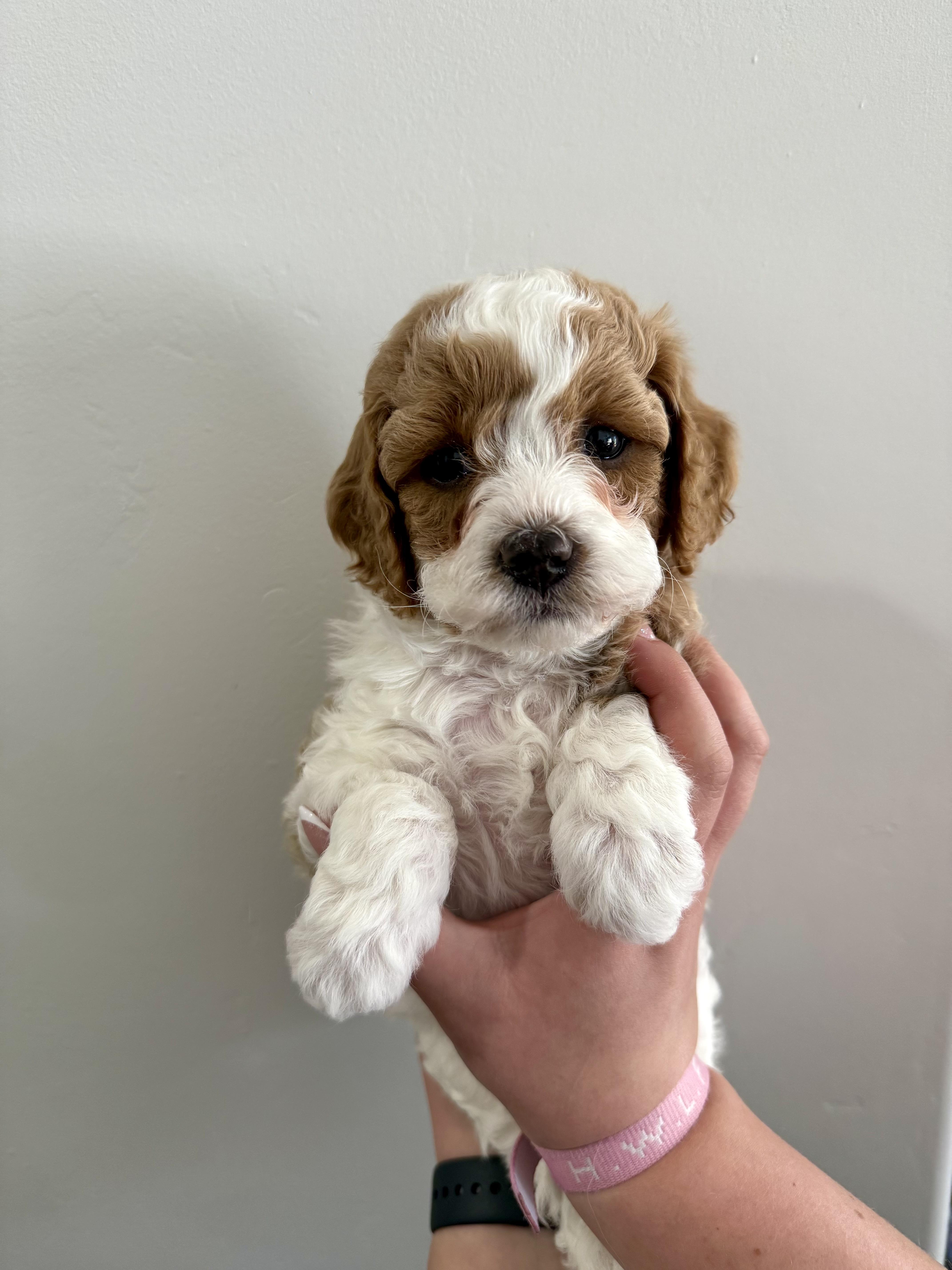 Our Cavapoo puppies include white, red, and blenheim. Cavalier King Charles Spaniel puppies are blenheim. Colors will vary depending on the parent dogs.