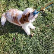 Brownie: Brownie boy is the sweetest cuddle bug. He will instantly curl into you when picked up and sleep in your arms. This boy wants to be where people are and will follow your feet as you walk around or play around wherever you stop. He loves chasing his rubber ball and will pounce on it to catch it. This boy is so gentle and will even find ways to play with our baby when she's on the ground with the pups.