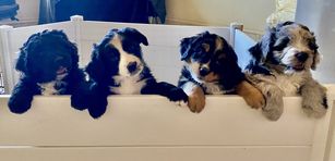 Our Aussiedoodle puppies include blue merle and black tri-color. Goldendoodle puppies include cream and apricot. Bernedoodle puppies are tri-color. Colors will vary depending on the parent dogs.