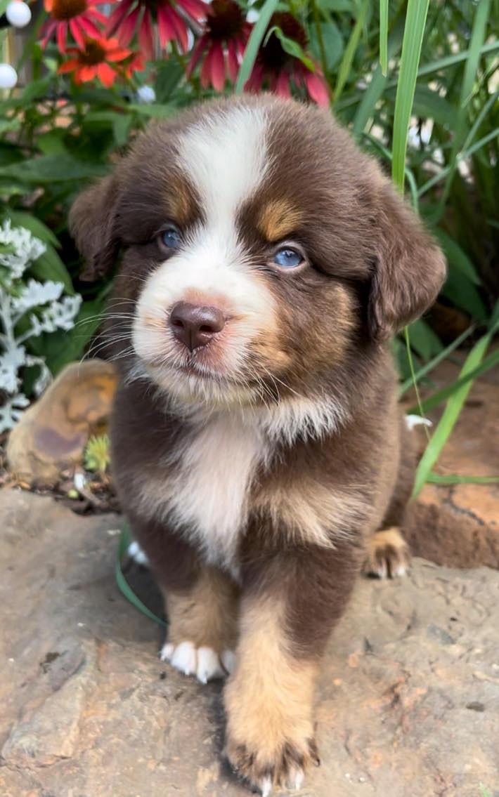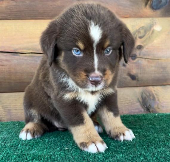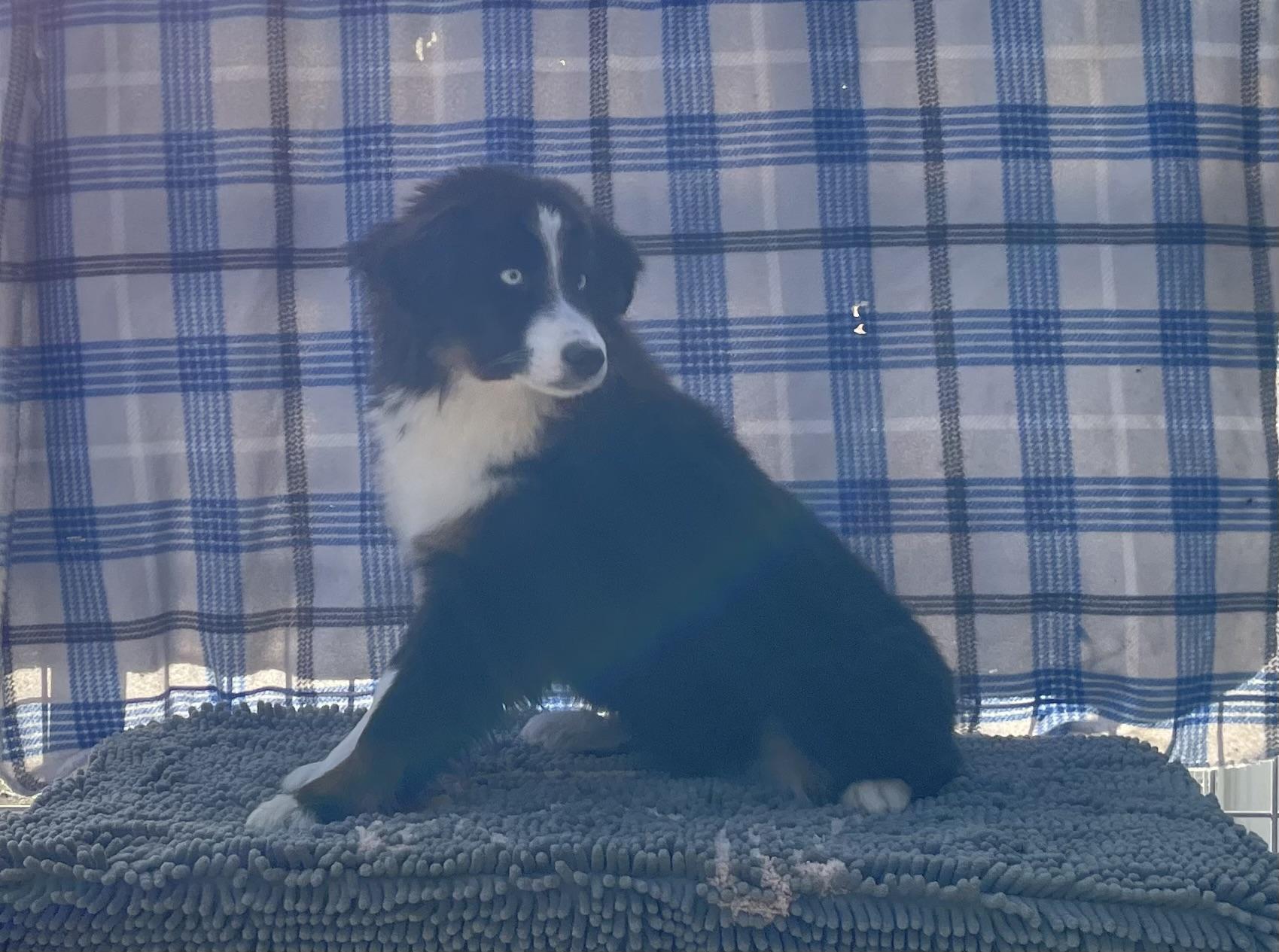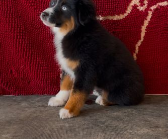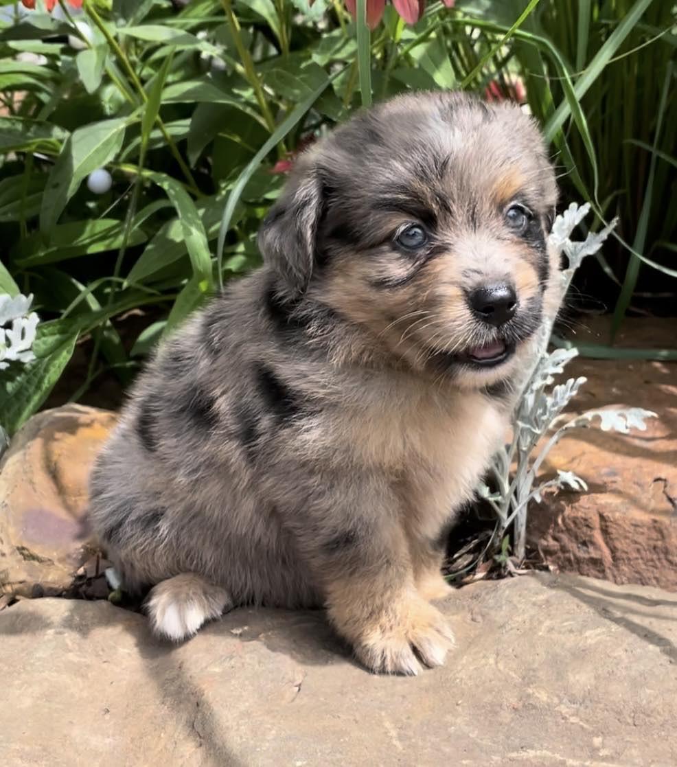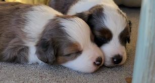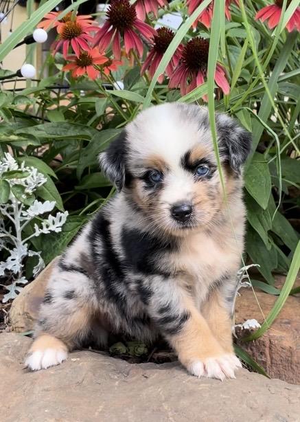 Our Miniature Australian Shepherd puppies include black & white, red & white, blue merle, black tri, red tri, red merle, red, and black. Australian Shepherd puppies include red & white, black & white, black, red merle, blue merle, red, black tri-color, and red tri-color. Colors will vary depending on the parent dogs.