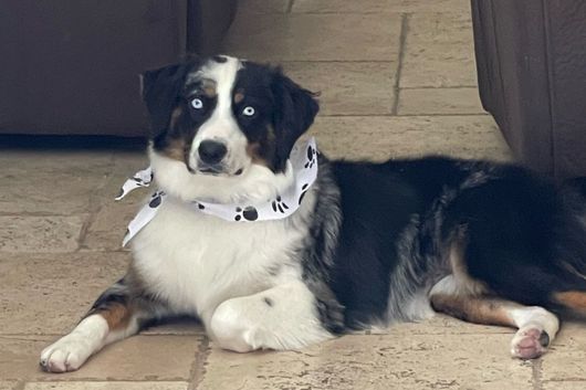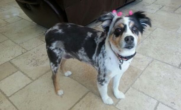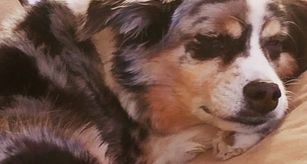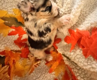 Red Merle, white markings , Tan points. Loves to please. She loves to swim and loves to be with family and watch television
