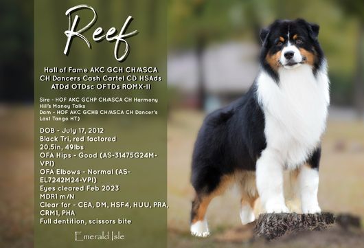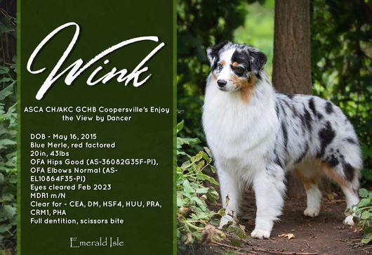 Emerald Isle Australian Shepherds reports to performing the health tests below on their breeding dogs. Ask your breeder about the tests performed on the parents of your litter. Learn more about health testing for Australian Shepherds.